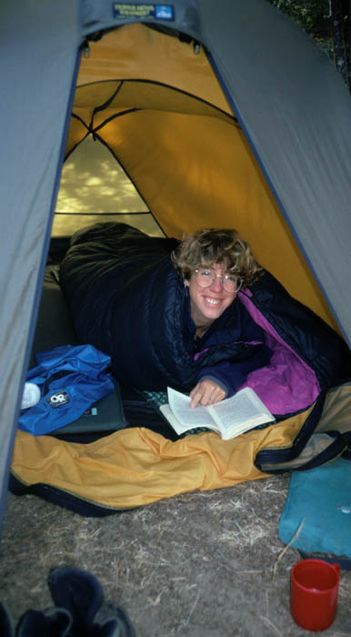Usually we would stop hiking and pitch the tent on a flat spot then throw our gear inside and inflate our sleeping mats. One person would collect water and filter it using our Pur Hiker filter that operated a bit like a small bicycle pump. The other would set up our stove- a petrol/Coleman Gas fuelled MSR Whisperlite- prime the stove by heating some fuel in it, then set it alight. Mostly we cooked and eat whilst lying down in the tent- our legs were pretty fatigued at the end of each day and it helped to take the weight of our feet as soon as we could. Our liquid intake was important and we often would have soup and tea to add to the water we drunk throughout the day. After food our bodies were ready to give in but with a little effort we each wrote up a diary and even read novels until we couldn’t stay awake any longer! Sleep wasn’t usually a problem and we slept soon after dark in the evening and woke up early to make the most of the cool mornings. In the morning we started hiking about an hour after waking after having a tea and muesli breakfast and packing up the gear. There was something satisfying about leaving no trace that we had ever camped at the spot and heading off carrying all our needs on our back!