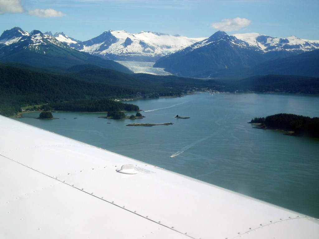 16th June 2004 After the wonderful sea kayak trip in Glacier National Park we headed back to Juneau on a single prop flight from the tiny airport at Gustavus. It was all very low-key, we hang out at a wooden shack café before we hear the pilot call ‘Brian and Martina, your flight’s ready!’ The plane flew low over beautiful and incredible scenery of deep green forests, snowy mountains and glistening sea and the flight was a worthy contrast to the boat we took on the way out to Glacier National Park.