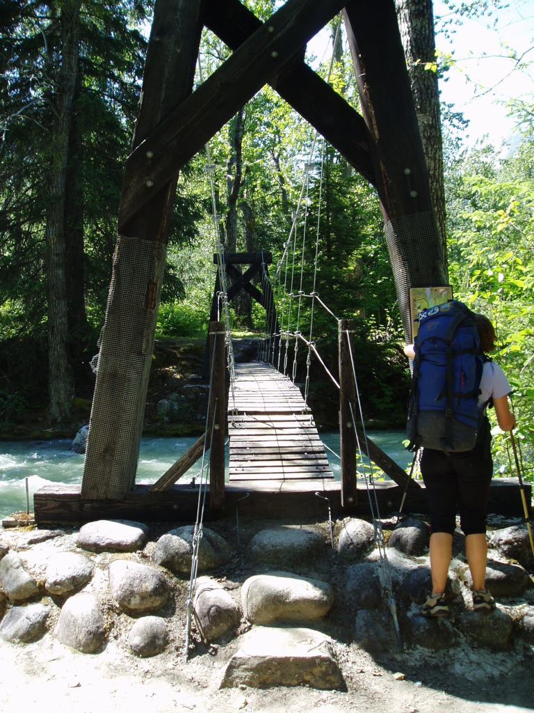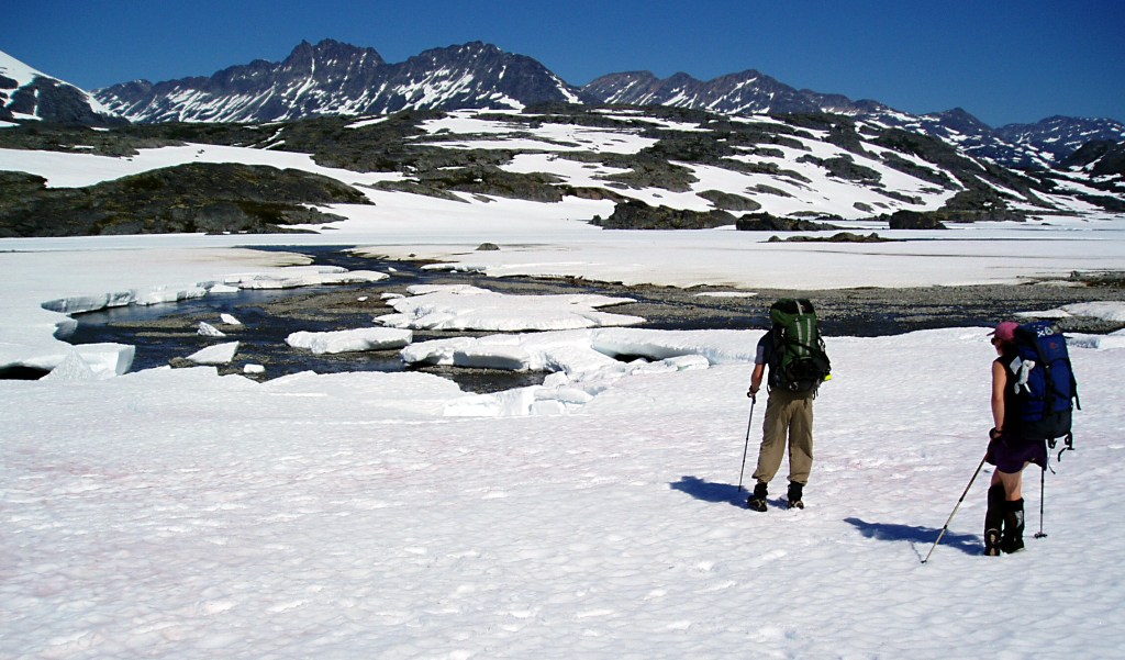 From the pass we headed north down broad melting snow slopes dotted with lakes. The lake snow edges and floating ‘bergs’ make for dramatic hiking but the heat built up on our last three miles alongside a torrent of water to Linderman Lake campsite was HOT. With the heat came lots of ‘Mozzies’ – our first proper outbreak of the holiday that started in April- so we were thankful to cook in a log cabin beside the camping area. 14 miles today, mostly on snow and we are pleasantly tired.