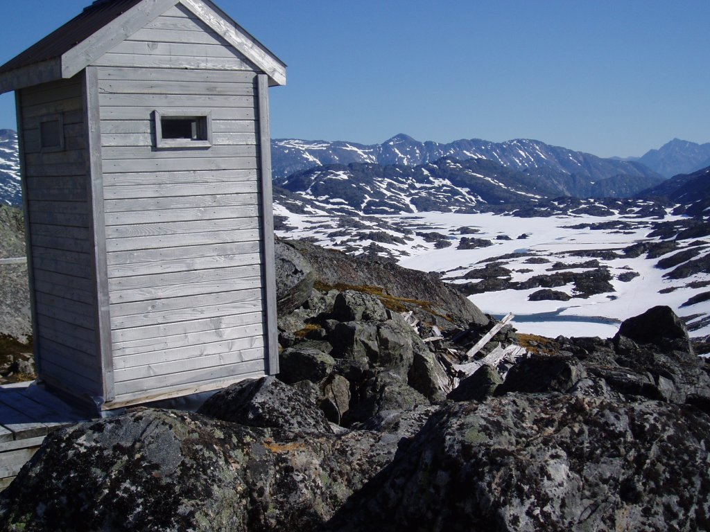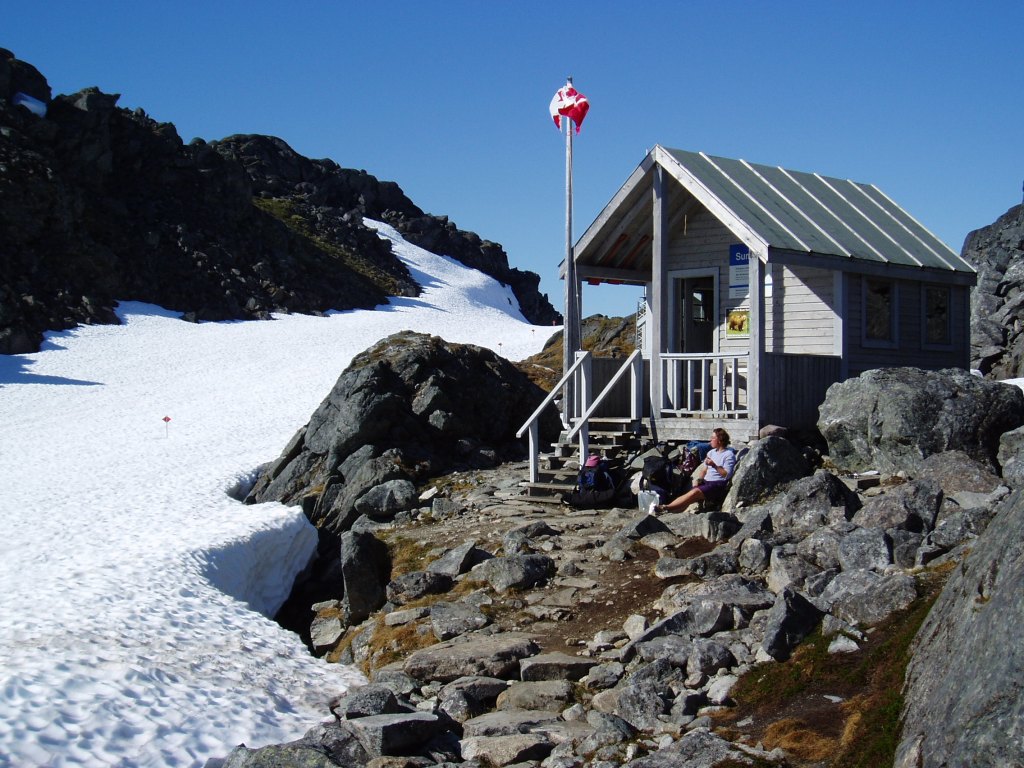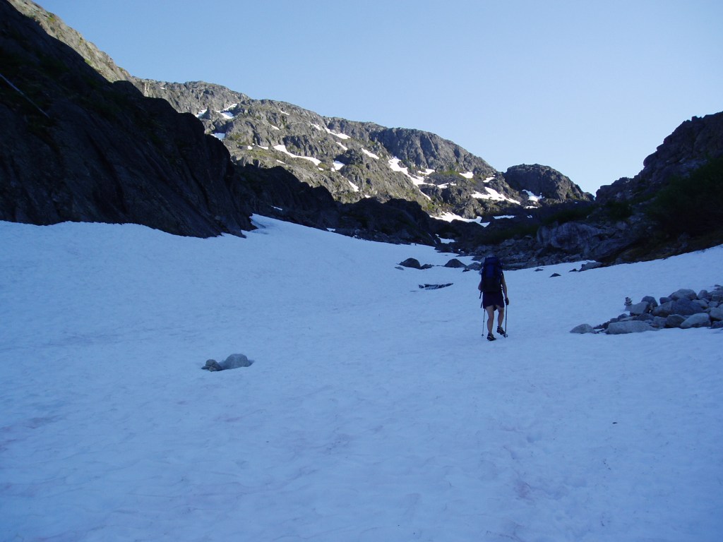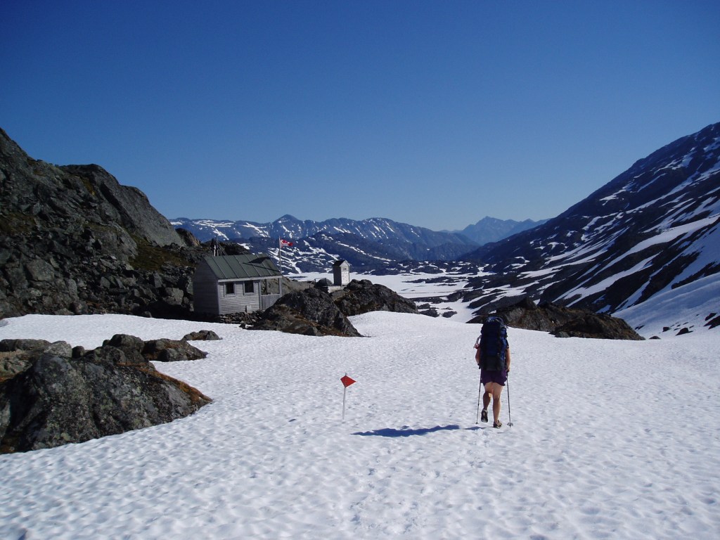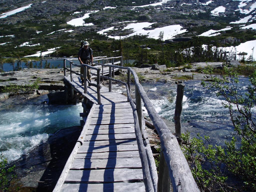 19th June 2004 Ranger advice was to start early to avoid mushy snow and collapsible snow bridges across rivers and we are awoken at 4am with hikers setting off pre-dawn. We ambled off at about 6.30am continuing through lush forest to exit onto boulder fields and then snow patches with tumbling meltwater streams all around. Above, we hiked over large snowfields which are pleasantly soft and make for good hiking right up to Chilkoot Pass with its US-Canadian border wooden shelter and Canadian flag fluttering.