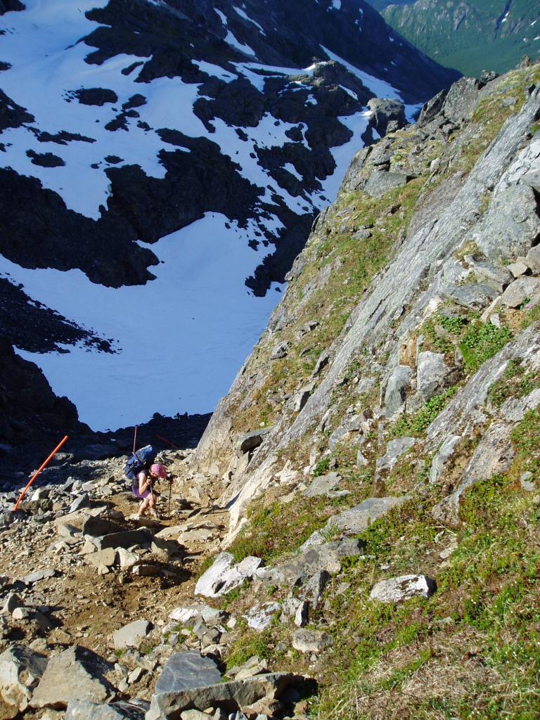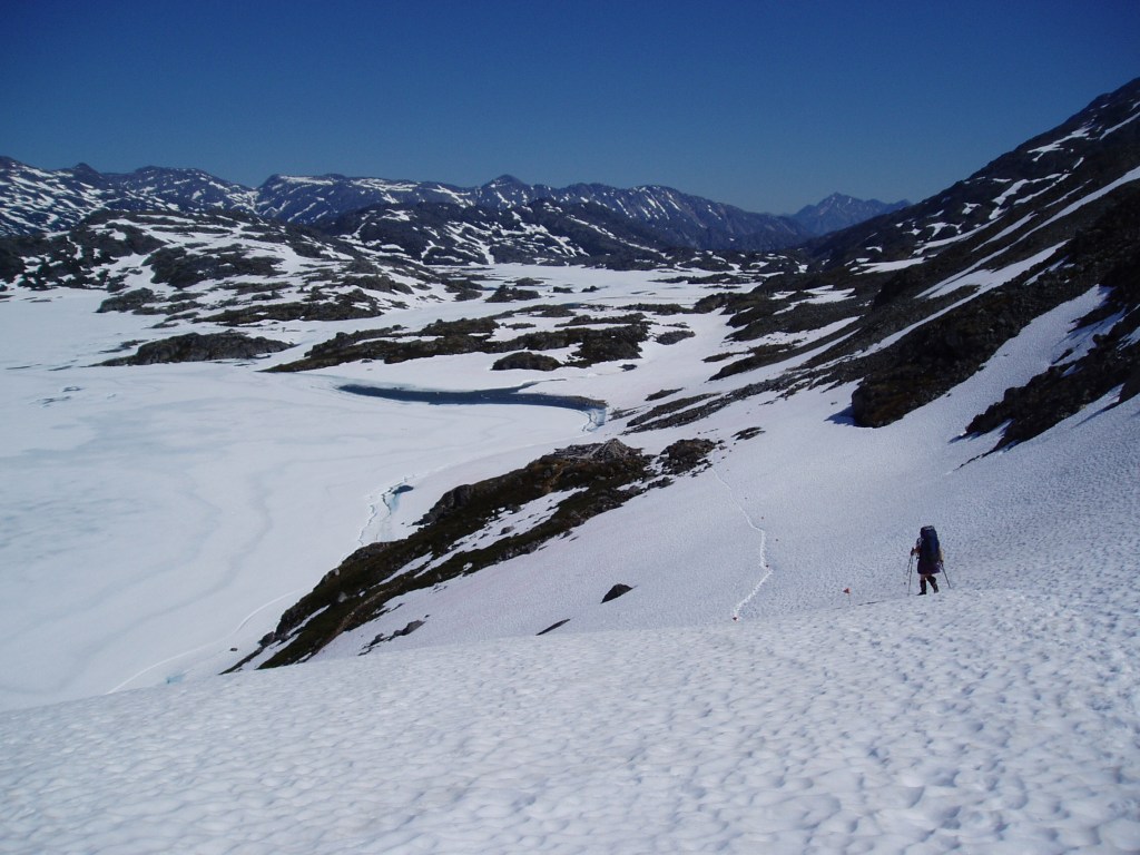 The pass is a grand spot with distant views inland to Yukon of snow, frozen lakes and mountains and we enjoyed a sun soaked rest here drying out the tents and sleeping bags.