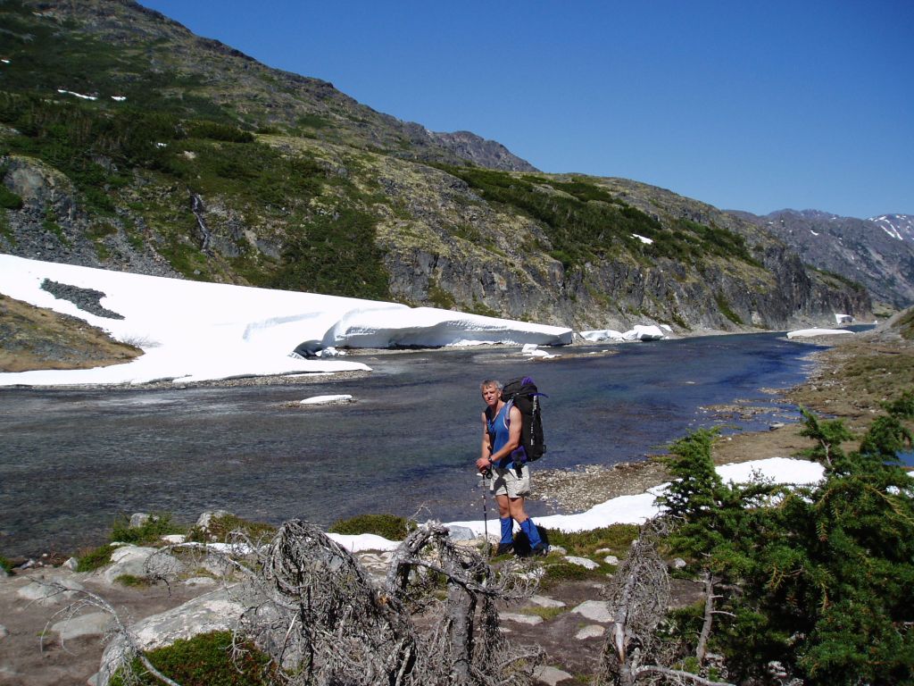 20th June 2004 It was ‘Mozzie City’ out there in the morning so we packed up camp with some speed. The heat picked up quickly as we hiked through a drier forest reminiscent of the Oregon section of the Pacific Crest Trail. Still scenic with lots of sparkling lakes and mountains on the horizon and by noon we had reached the road from Whitehorse, Yukon back to Skagway – the end of our hike.