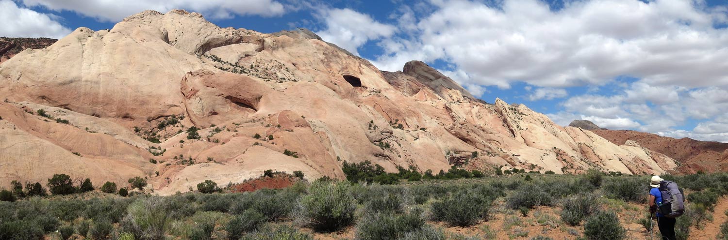We had a pleasant start down Swap Canyon on a meandering gravel wash surface. It was cold and windy but warm when the sun hit us. After an hour or so we emerged out of the canyon into colourful views of the waterpocket fold and its multiple pinnacles of rock.