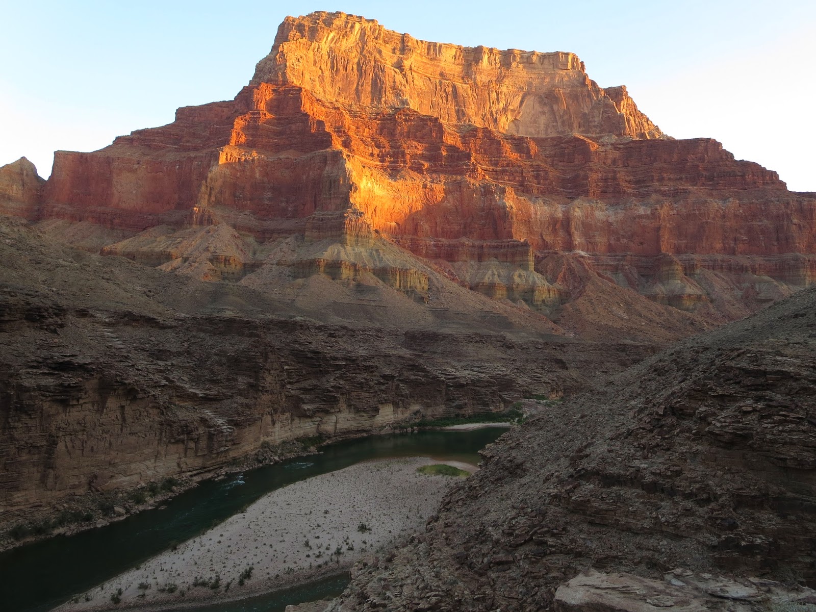We woke at 4.45am to get some distance in before the sizzling sun hit us again. The scenery and hiking was magnificent down here but the heat- was brutal. The trail now though was excellent, contouring up above the river on sandstone terraces (the Tapeats rock layer).