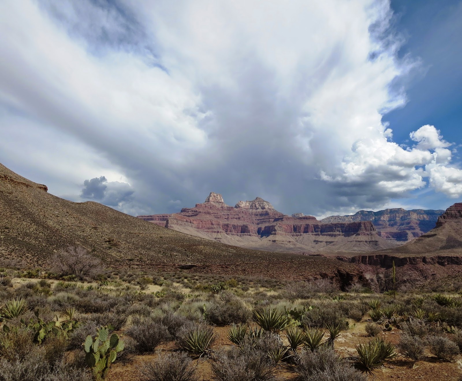 A great evening in camp with some distant thunder and rain to cool things down. Both of us were tired- we went to sleep at 7! With an alarm at 4.30 am we were off hiking into the dark at 5.30 am with head torches. It was light enough at 6 am though as we left Cottonwood Creek and headed westwards in a huge arc on a plateau (the Tonto) way above the Colorado river itself.