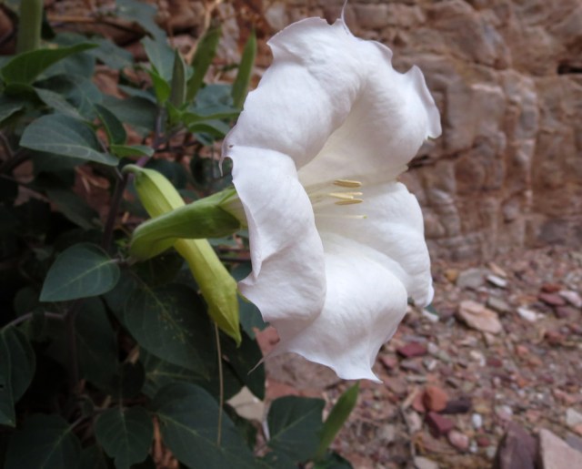 Awake early again at 4.45 am feeling fatigued after some hard, hot days! It was a rough little trail bordering the rim of 75 mile canyon, which we had to deviate round then drop back down into to reach the Colorado again. The walls of this narrow canyon were a lovely smooth quartzite and there were fantastic large white datura flowers growing here (great looking flowers that give out a scent at night to attract moths).