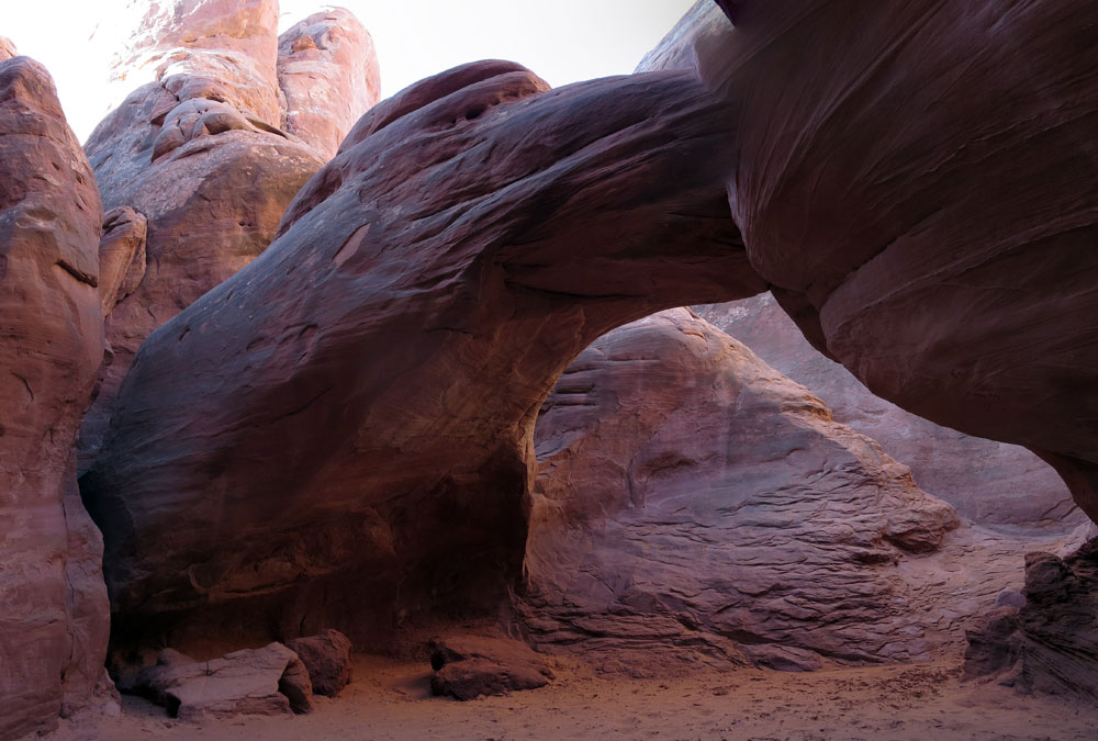 We only followed the first half of the alternate down to the park road, then crossed the road and continued down Courthouse Wash on the guidebook route. This gave us the advantage of a water source to camp beside and lower Courthouse Wash is rather laid back and provides easy hiking down to the bridge over the Colorado River near Moab.
