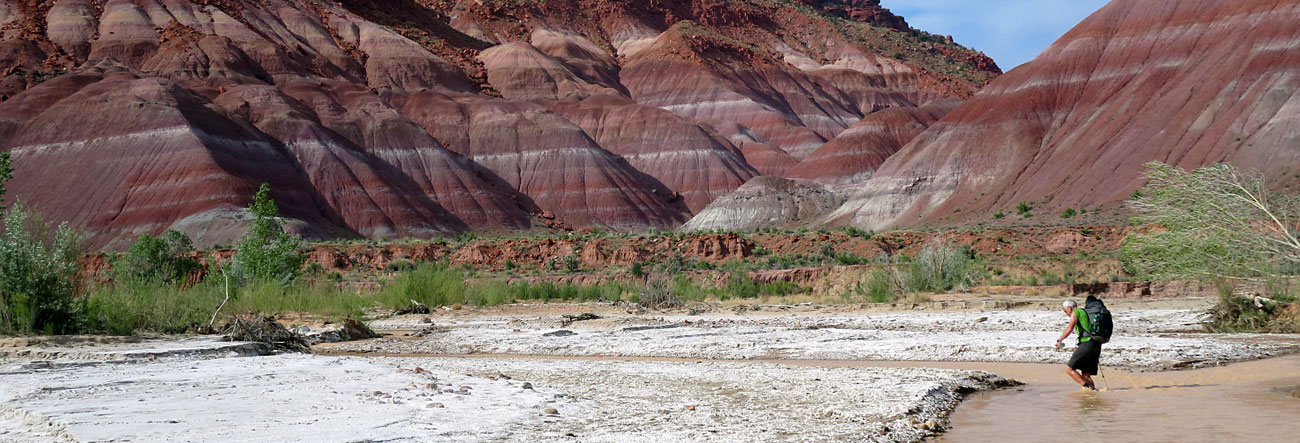 Turn left (south) and follow the good trail down through pinyon juniper. It eventually opens out to great views above the Paria. From there the trail drops down to the river level itself.