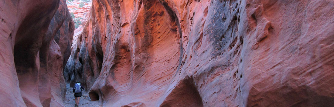 Continuing down Wolverine was easy following a dry sandy wash with red Wingate sandstone cliffs towering above. The canyon gradually narrowed and meandered with a number of massive alcoves and cool scooped holes in the walls.