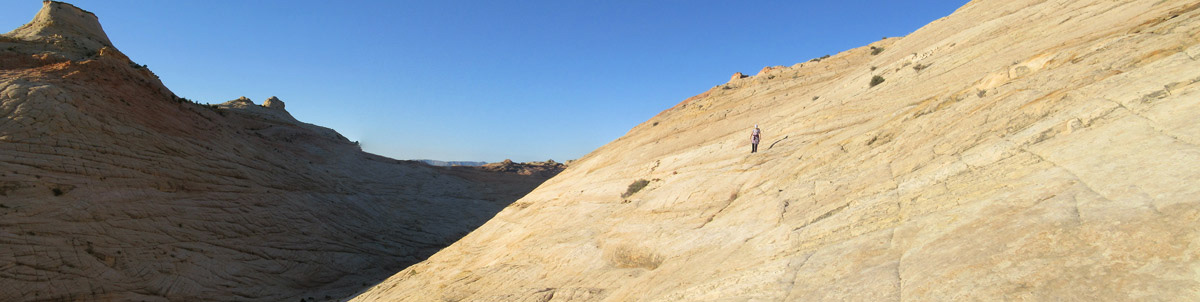 After a superb start to the morning we continued hiking north along the slabby eastern side of the dome escarpment until it faded away and we turned west to follow shallow washes into Deer Creek. Just before Deer Creek we hit an obstacle of a 30 foot cliff but after a bit of hunting around we found a slender tree trunk lying against the cliff and were able to shimmy down to the bottom. A bit more scrambling through bush, across Deer Creek then up walls on the west side aided by some juniper trees and we emerged onto a trail heading northwards upstream. Relaxed hiking past autumnal cottonwoods followed before we hit the Burr Trail tarmac road at a campsite and picnic tables.