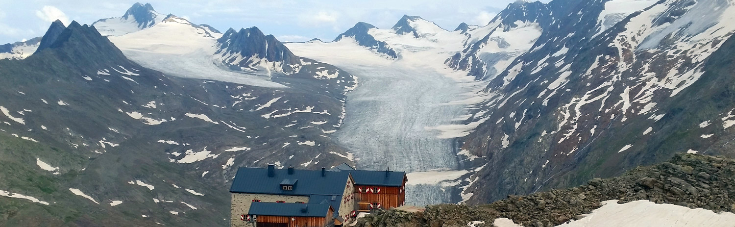 Tuesday 17th july 2018 Ramol Haus to Martin Busch Hutte Swirling cloud in the morning added to the atmosphere as we hiked up a short distance then over the Ramoljoch 3186m. The descent was down beside a nice sweeping glacier field followed by boulders then a high traverse southwards on an unusually easy path. We stopped for a brew outside the small ‘Schafferhutte’ once on a bigger trail, then followed it up to the large Martin Busch Hutte.