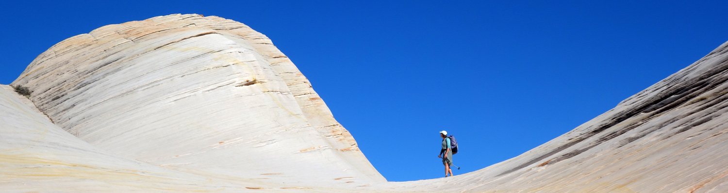 The trail continued on a mix of sand and slickrock until we arrived at the ‘White Domes’- we had camped here last year but it was no hardship to visit this stunning series of rocky domes again, this time with the strong midday sun and deep blue sky adding to the scene.