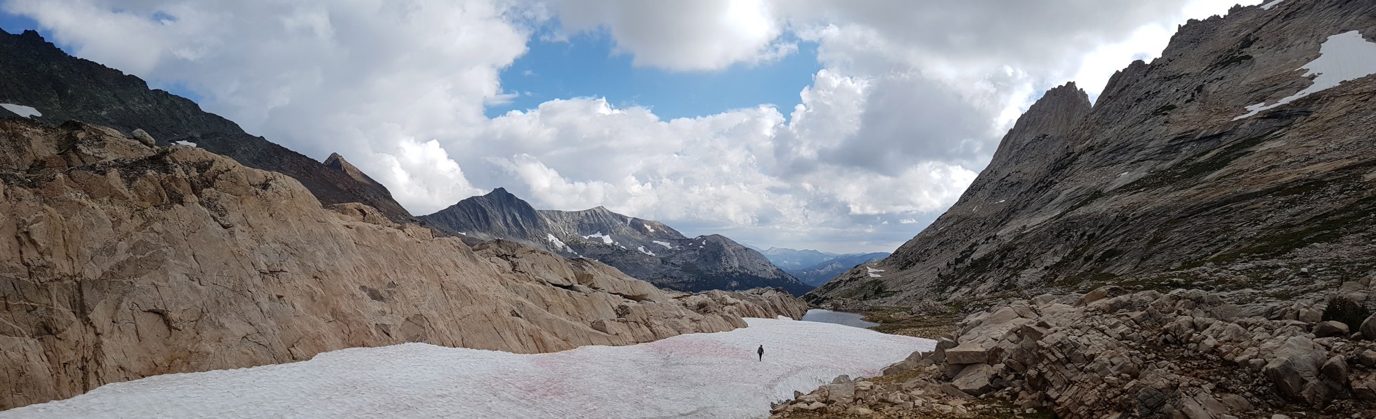 Scott the friendly campground host gave us good directions on how to navigate through the myriad of local trails to reach Horse creek and the wilderness area to the south. The weather looked a bit dodgy with foreboding cloud build up and on and off rain but the views ahead southwards to Matterhorn Peak were encouraging. The trail was pretty clear but one section by the creek through thick willow bush soaked us from the waist down. Gradually the terrain got wilder and more barren with scree sided metamorphic peaks and faint trail leading to a wonderful little snow bowl just before the pass.