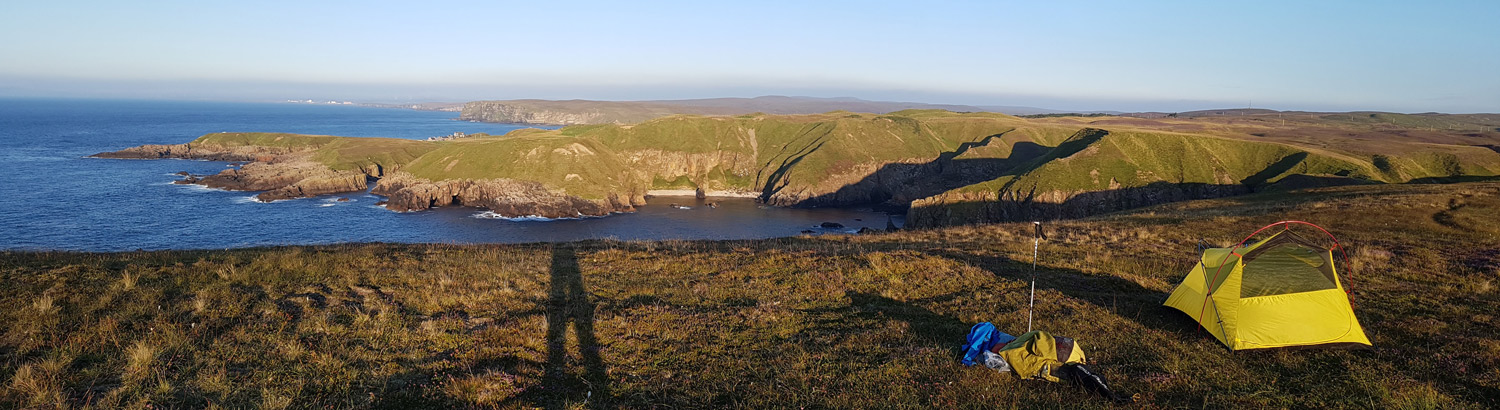 Summary This was a scenic hike with stunning coastal cliffs and expanses of sand but was tough going due to a few factors. There were very few trails on the coast in between the town and road sections and the terrain above the cliffs was heather and peat, mostly not too bad for walking but at times very wet and tussocky. The midges were pretty awful at camp as feared, even when pitched on a sandy beach at high tide level. Very little sitting outside the tent with a cup of tea gazing at the scenery here! There was a bit of road walking, such as the 6 miles of busy road to get round the nuclear power station at Dounreay.