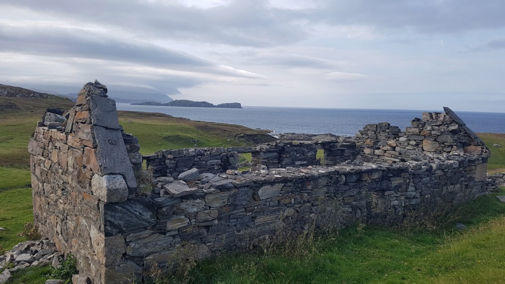 A better jeep track over the hill eastwards down to the road at Kirtomy provided some easier walking and then I had another good jeep track up the hill north of a big antenna with lovely views back west across Swordly Bay. At this point I headed cross country north east a bit inland to the ruins and trail at Poulouriscaig over quite remote feeling ground. A stop a bit further on on top of an old concrete building allowed me to dry off and carry out some minor repairs to the tent guy lines. My feet were also suffering a bit from the continuously wet underfoot conditions and sand in everything.