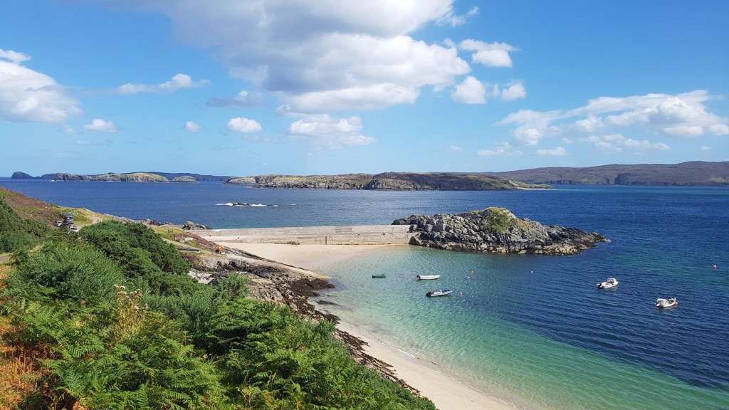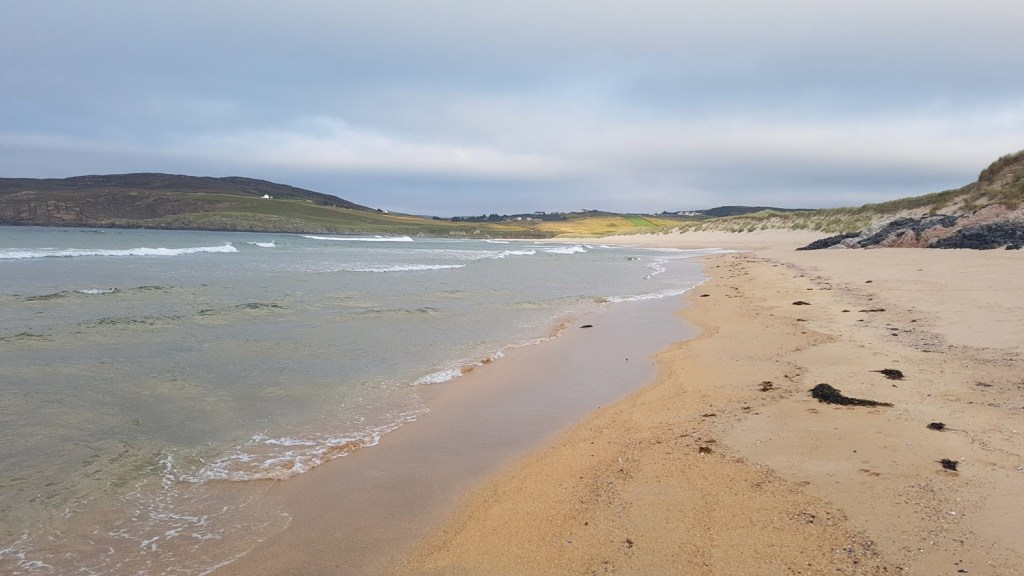 Monday 17th August 2020 The weather was set fair for the next few days as I left my car near Tongue, ready to hike east following the coast as much as I could. Tongue is on the side of the ‘Kyle of Tongue’ sea inlet– which surely must rank as one of the most beautiful places in Scotland with huge expanses of white sand exposed at low tide, a jagged mountain backdrop inland and a number of islands dotting the horizon out to sea.