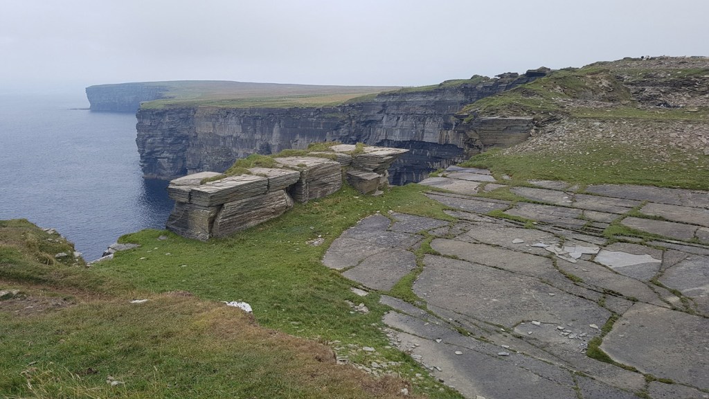 I headed east again along the cliff tops over tussocky heather past more grand cliffs. The rock type changed to sedimentary here with tilted bands and some massive overhanging rock faces. Later on this section became a bit of trudge though over continuously peat haggy ground then heavily dug up areas as I passed Sandside House and into Reay. I had hoped for a shop here but everything seemed closed – I did at least pick up water from a hose pipe in the local cemetery.