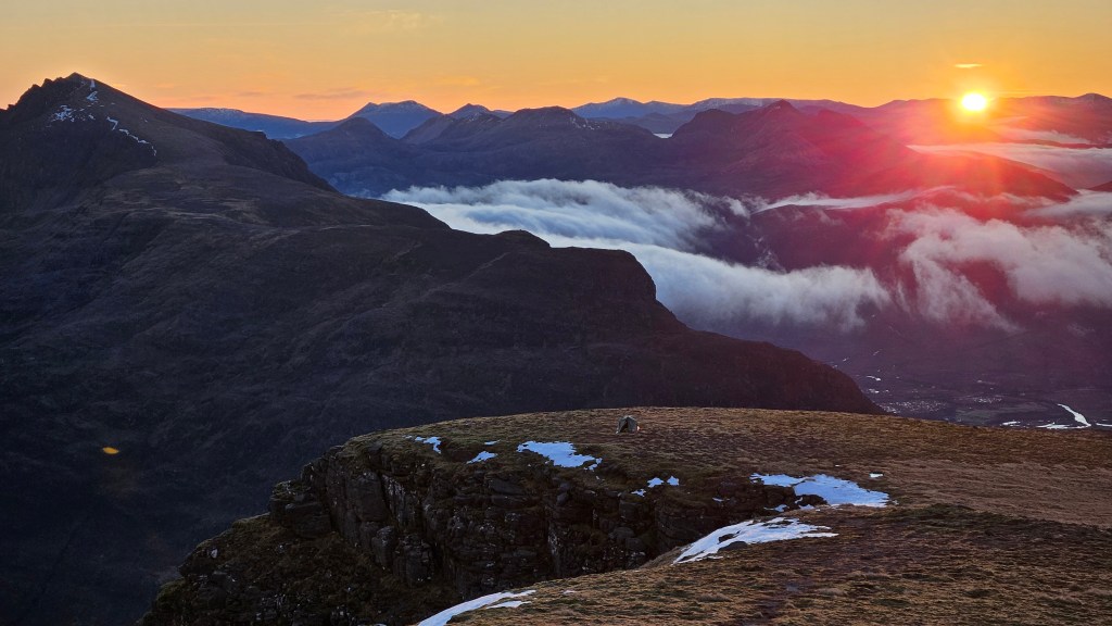 Summits in Scotland are relatively easy to reach and often afford decent, dry camping spots with short cropped vegetation- as long as you are prepared to hunt around a bit. The views can be panoramic and fantastic with the special light you can get at sunset and sunrise.