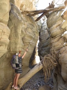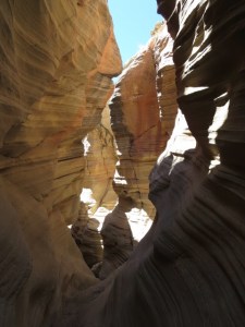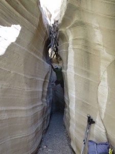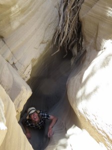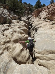 The slot is wonderfully scenic and after a short, maybe 6 foot slickrock descent, had little technical difficulties. We found no water here.