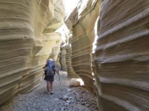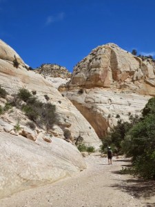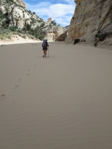 Exit the slot and cross the Dirty Devil River. This was an easy ankle deep splash for us but the Devil can live up to it’s name and rise quickly so watch out! The Dirty Devil water gauge provides data on water levels. We camped and took water from the Devil with no ill effects after treating with aquamira. This is the last until Poison Spring probably 5-6 hours away.