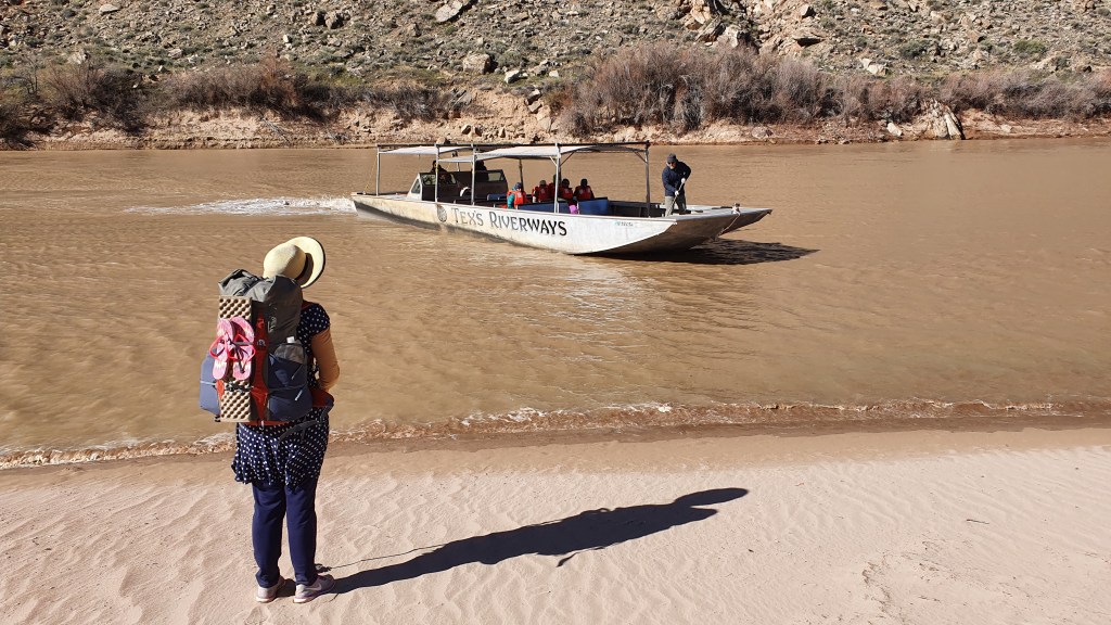 We camped near the south bank of the Colorado River on the first night. Brian had arranged for a ferry operator to pick us up at 10:00 and take us across. They were taking hikers from Moab to the opposite northern shore and that all worked out very smoothly.