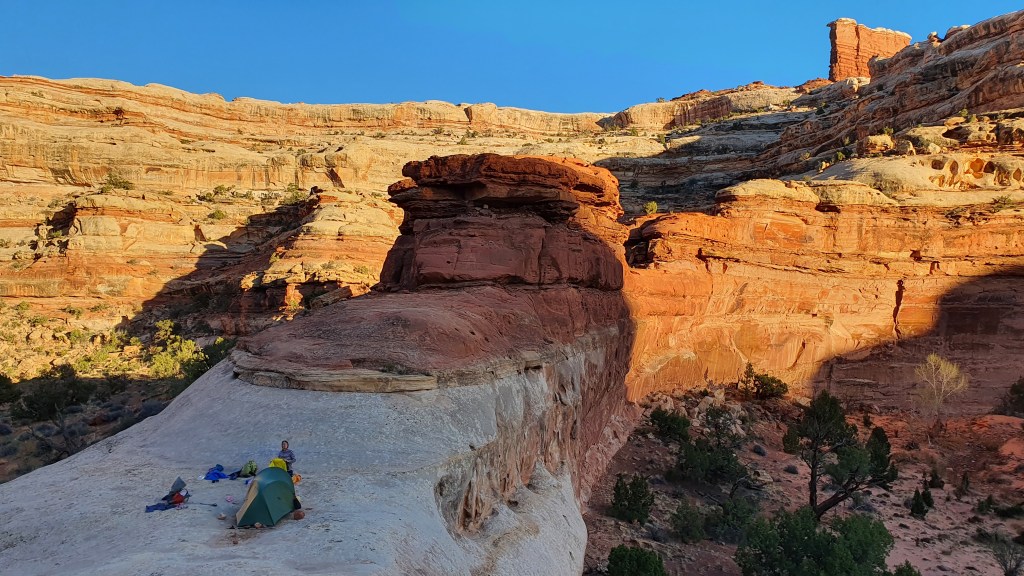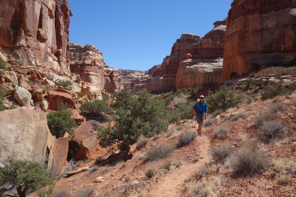 On this section we were mostly on an alternate to the Hayduke Trail to take in an area of very remote and intricate canyons called “The Maze” which we hadn’t seen before. In 2014 we took another alternate and what both have in common is that from Needles in Canyonlands National Park, we end up at the Colorado River at a place called Spanish Bottom. From the north bank of the river we climb up again over remote plateau and end up in the well named Happy Canyon and then cross the even more appropriately named Dirty Devil river (a very muddy tributary of the Colorado). Credits for the route go to Jamal Green who describes it on his excellent Across Utah website.
