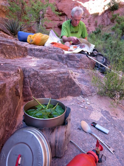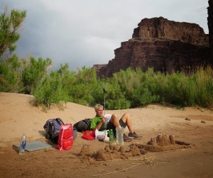 From there we hiked closer to the river and saw our rafts from yesterday float by. The rafting looks fun but despite the heat, this hiking adventure is the way to go for us. We passed the Tanner Trail campsite and another three miles on to Cardenas Creek. Here the trail climbs up away from the river for a few miles but the heat was too much for us to consider doing that in the afternoon, so we stopped under some mesquite bushes next to the river for some meager shade.
