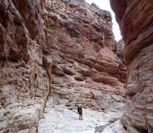 Six miles in and we reached Grapevine Canyon – a potential water source. We split to look for water; Brian went down canyon on slick rock and Martina up canyon to successfully find some pools of water. Another 4 miles in and we found shade to rest in Boulder Canyon. The weather built up a bit and it didn’t heat up too much – which was a relief as this is frying territory!