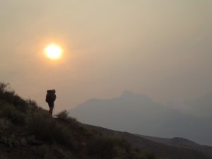 We set off at 6pm in deep haze with an orange globe of sun just penetrating through, but it remained sweaty and muggy. The terrain had a Mars like feel to it – exaggerated by the red haze. The character of the hiking here is unique as we climbed up the jaggy Escalante ridge with hazy views back down to the river. We walked at a flat out fast pace to make it back down to the river to camp before dark. Descending from the ridge on red soil we reached the black depths of Escalante creek which provided an enjoyable and surprisingly easy route down to the river. That was a great evening hike- we would love to do it again in clearer weather [hey- we did, in 2022…]