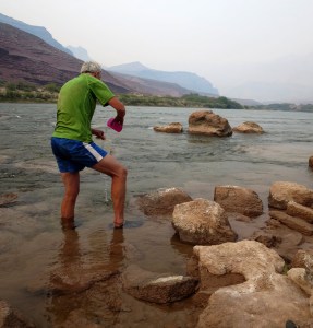 Awake early again at 4.45 am feeling fatigued after some hard, hot days! It was a rough little trail bordering the rim of 75 mile canyon, which we had to deviate round then drop back down into to reach the Colorado again. The walls of this narrow canyon were a lovely smooth quartzite and there were fantastic large white datura flowers growing here (great looking flowers that give out a scent at night to attract moths).