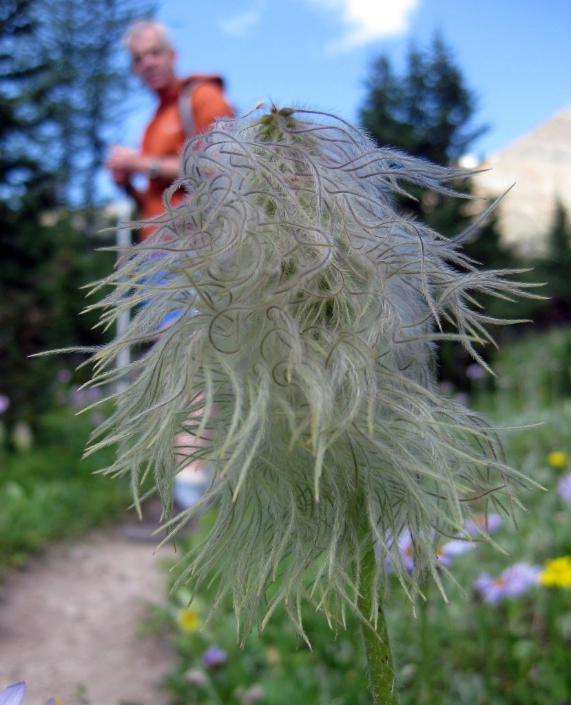 The first hour or so in lodgepole pine forest was a little dull (after our wonderful previous hike to the south) but we soon emerged out onto Little Shovel Pass for some views under a leaden sky. Walked through meadows with light rain we noticed that the flowers were fading a bit now into early autumn. By Big Shovel Pass the views improved and we crossed bare shale slopes before dropping down to Curator campsite after 5 hours of easy walking. Martina looked very mountainous with her pink flip flops attached to one side of her backpack and a bottle of red wine to the other!!