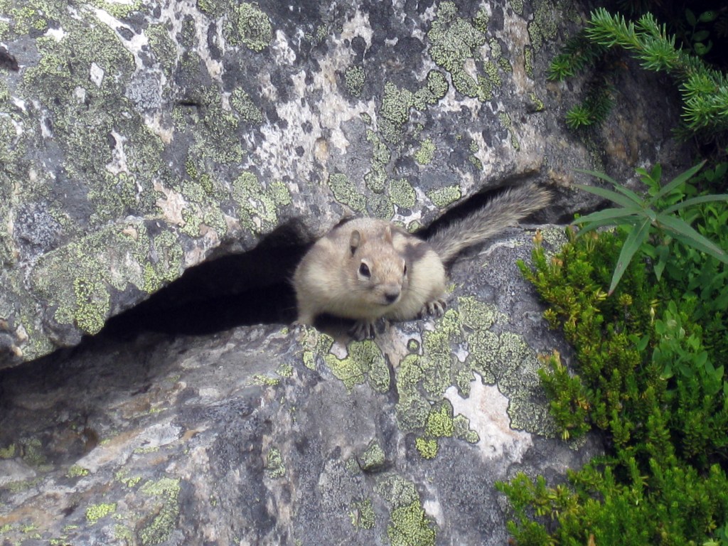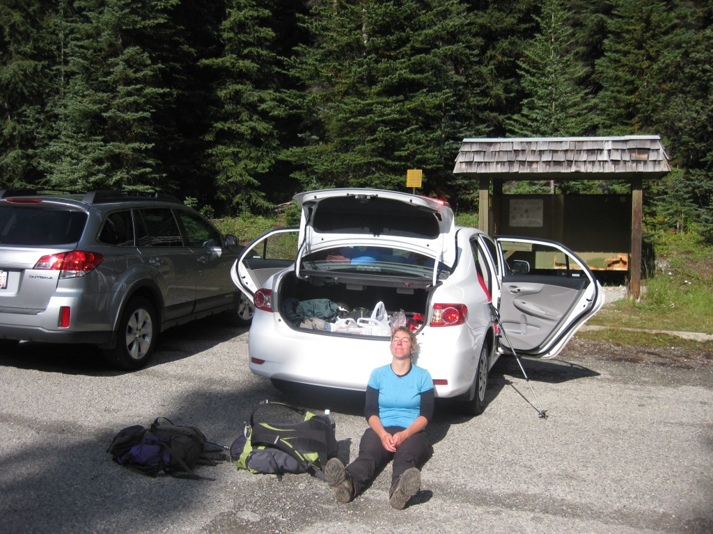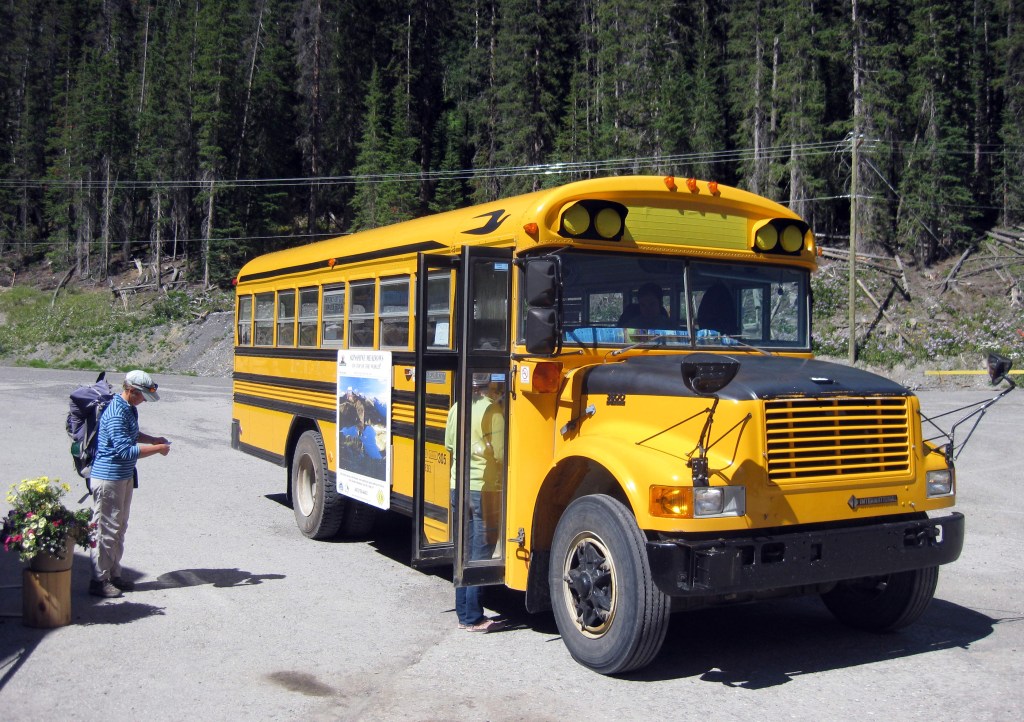 We left the rental car at Sunshine Meadows, where a bus service runs to the top trailhead saving a couple of hours walking up a dirt track- we have done plenty of that before! Waiting for the bus was a pleasant chance to chill out sifting gear for the next 6 days, eating bagels and watching chipmunks.