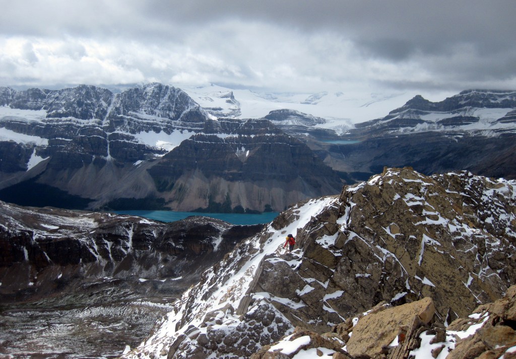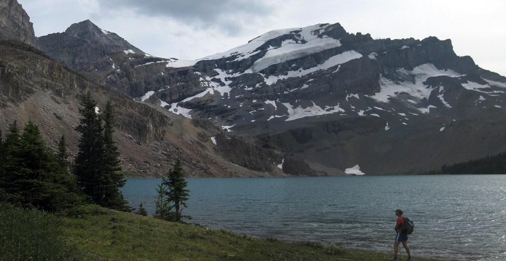 On the way up, Bow Lake below