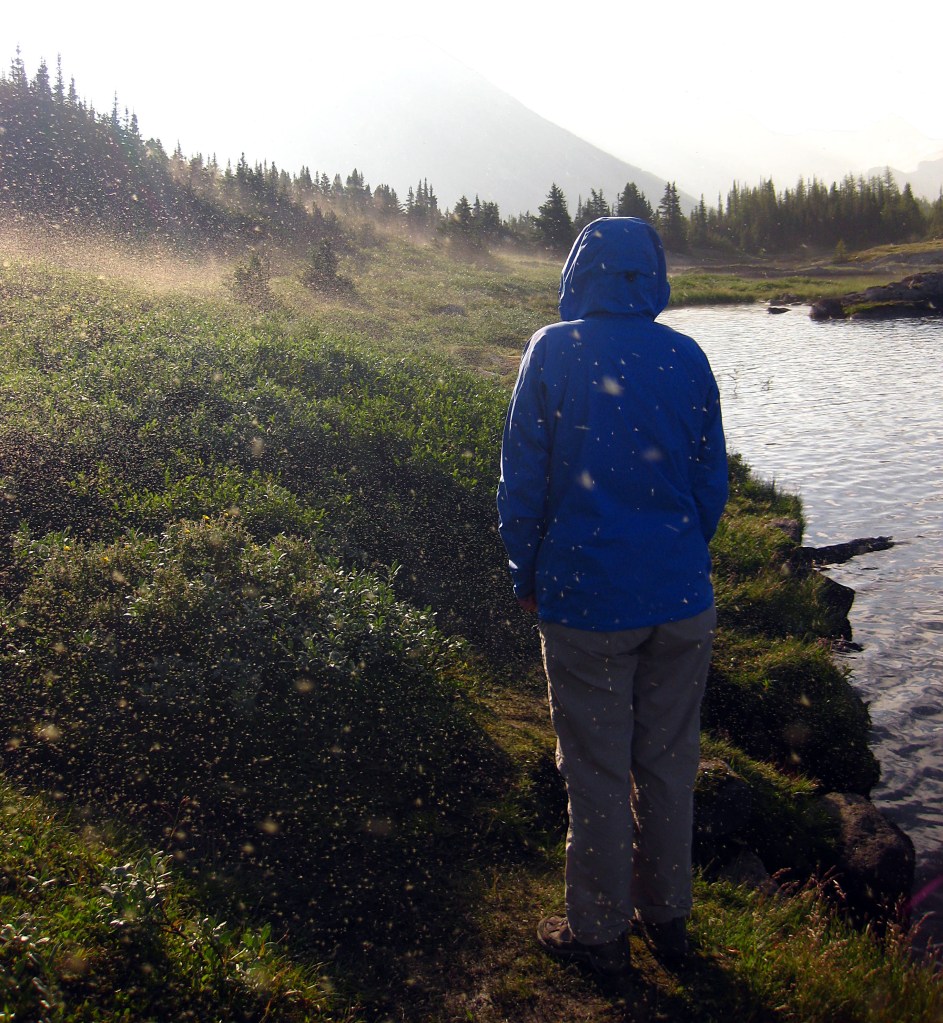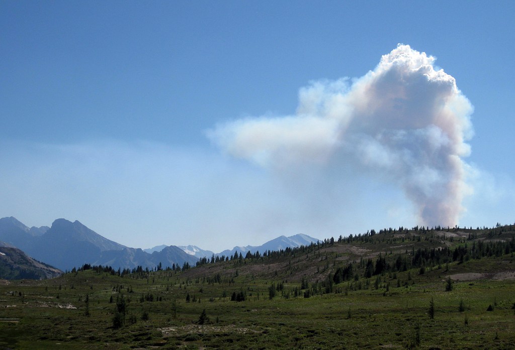 Day 4 18th Aug Another overnight freeze but we set off up valley northwards in excellent cold, still conditions retracing our first day to near Sunshine Meadows. Before that we managed another great swim in Howard Douglas Lake but couldn’t linger due to fierce horseflies. We split from Sunshine Meadows to strike out north west towards Healy valley and our next campsite. An ominous plume of smoke appeared to the south west, likely to be a forest fire in the distance.