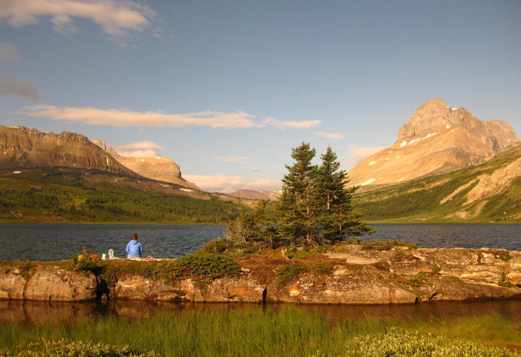 We had a warm relaxing stop at the Pinto Lake outlet lazing around in the sun over lunch. A pleasant rough trail around the lake rim made for an easy start with the sound of jays overhead, before the long climb up to the high pass above Waterfall Creek. We found a small spring on a grassy shelf and, after sniffing the air and declaring the area somewhat optimistically bear free, we pitched the tent. It was an awesome spot.