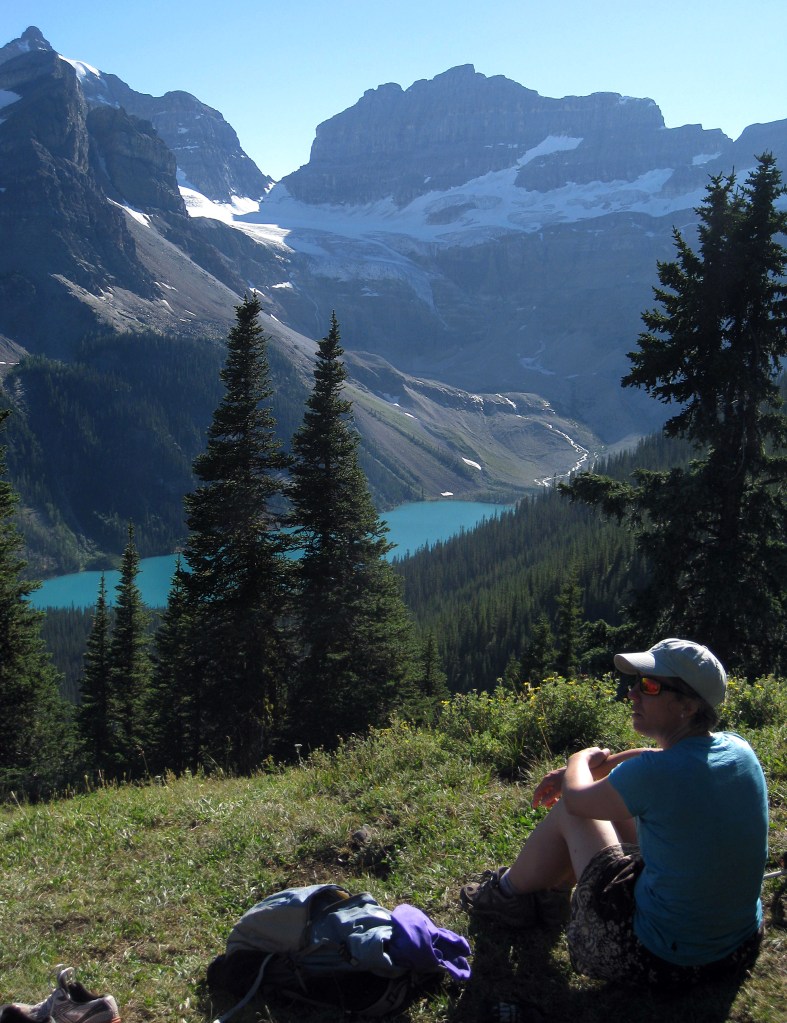 Later we arrived at Lake Magog in even hotter sun and reached our campsite. It was busy though and we hunted around to find a patch of grass in an overflow area but with lovely views to the aforementioned Mt Assiniboine.