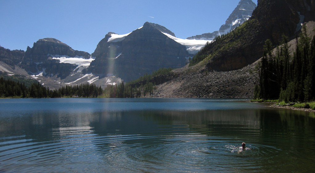 After pitching the tent, we headed out at about 3pm round Lake Magog to Wonder Pass past some cabins then flower meadows. We dropped down the other side for about half an hour to an impressive view point to the turquoise glacial Gloria Lake. On our return we managed a chilly but fab dip in the wonderfully named Gog Lake with a couple of eagles soaring above.