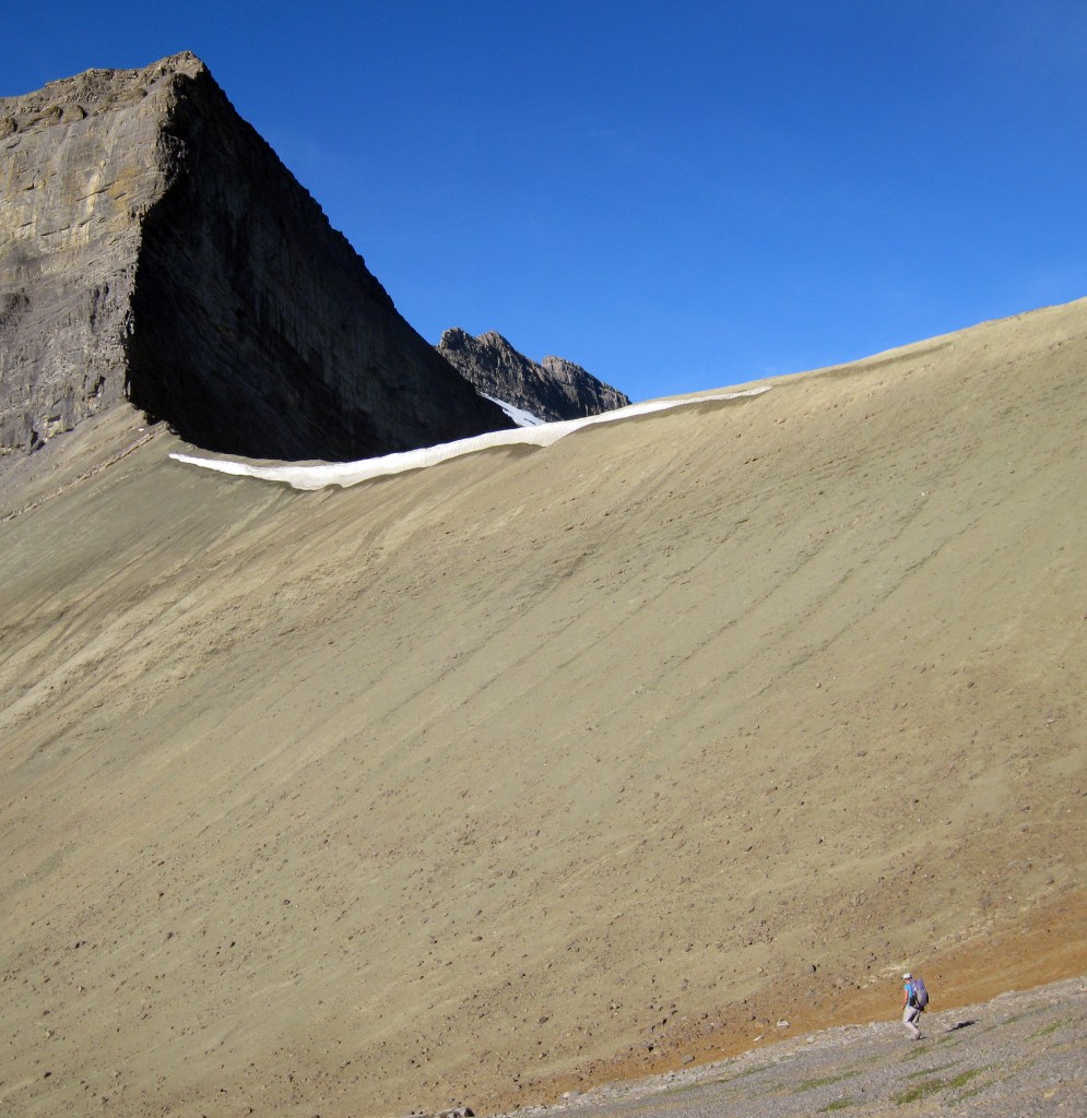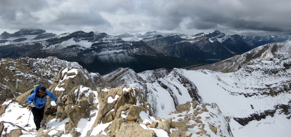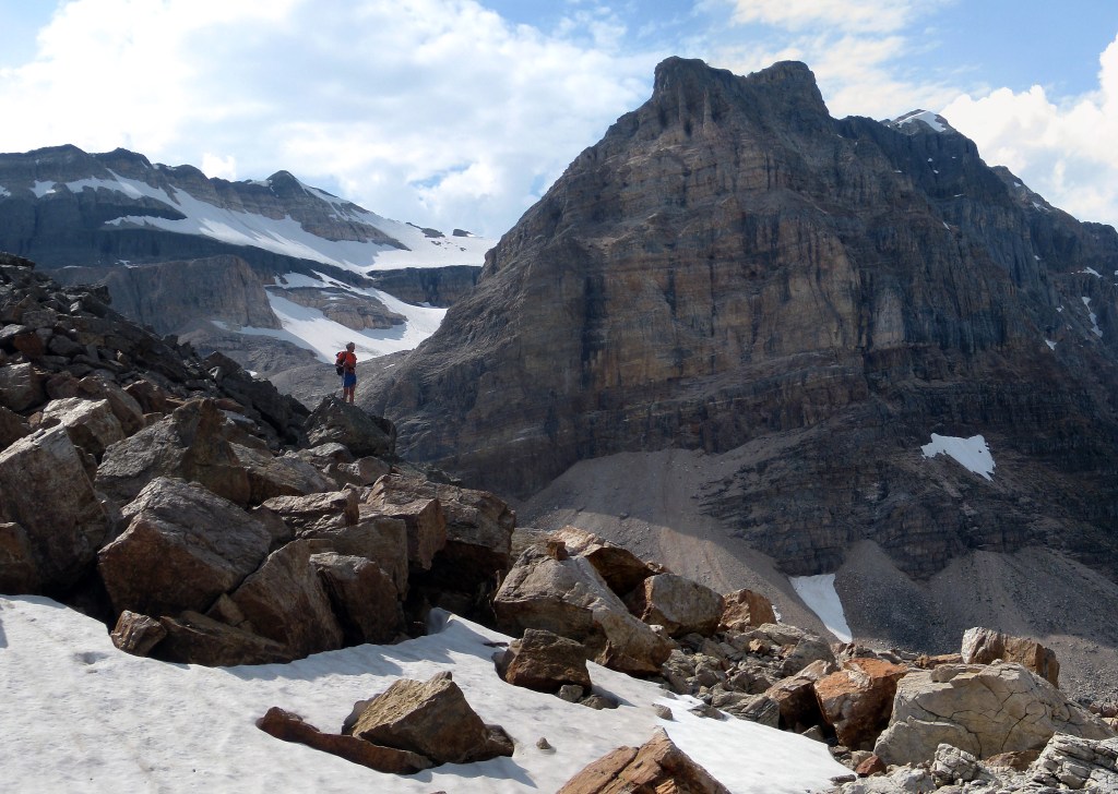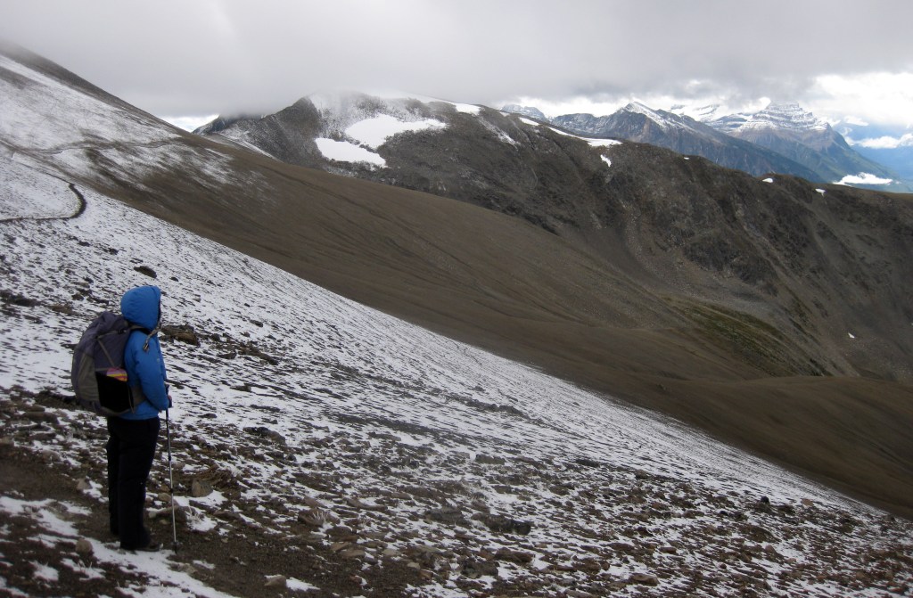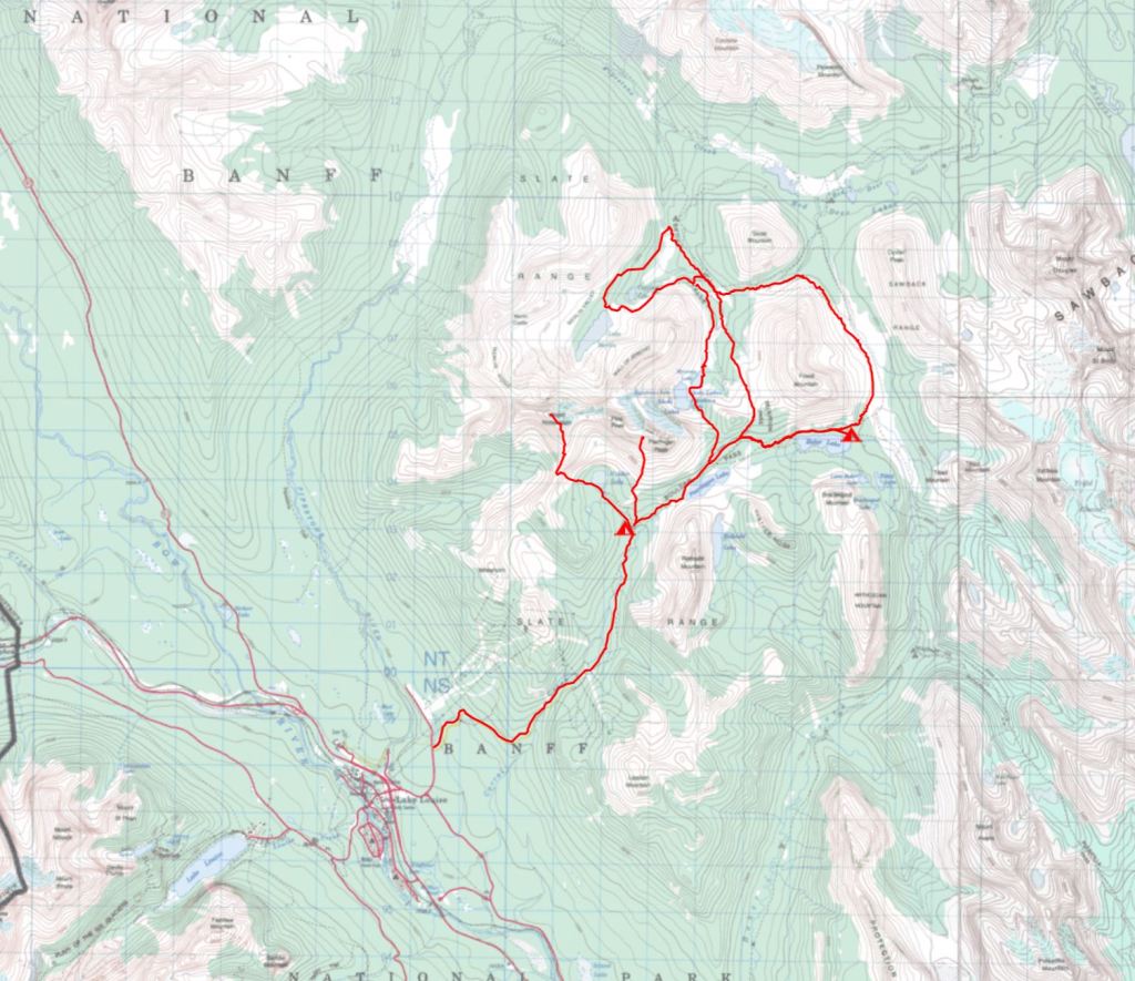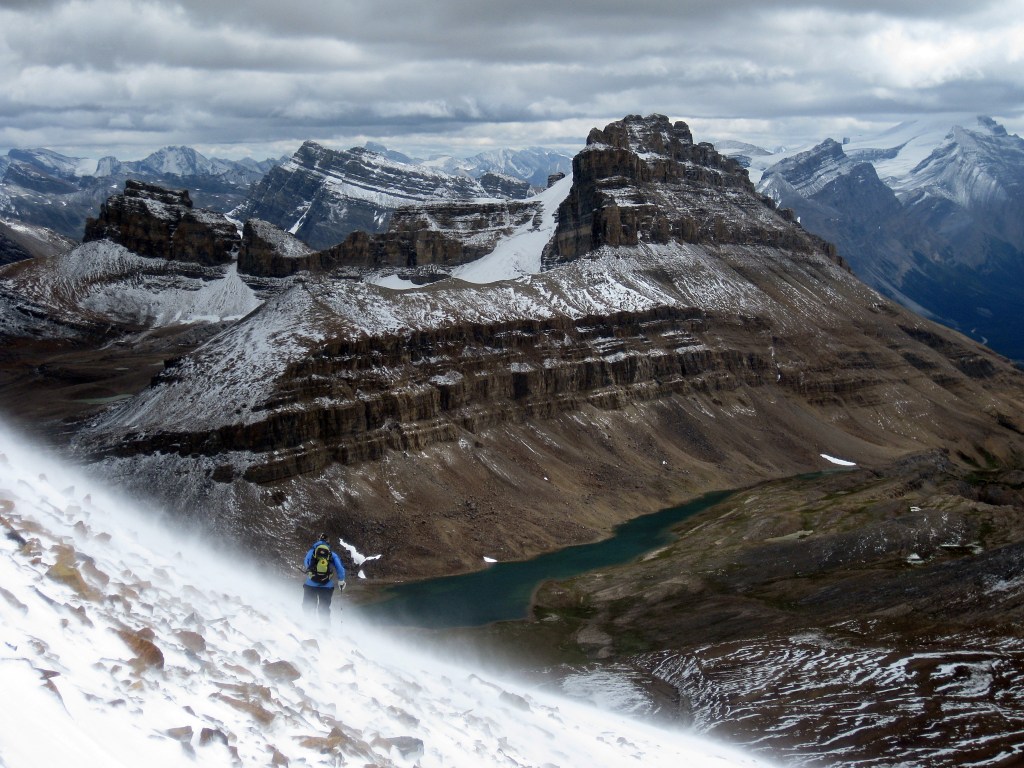 Day 1- Starting at the Fish Creek Trailhead below the Lake Louise ski area, we walked in for about 3 hours to our camping spot we had pre-booked at Hidden Lake. The tent was pitched in a hurry as the mozzies soon found us before we hung our food up away from any potentially hungry bears. In the afternoon we scrambling up Mt Richardson, a peak above the lake and a chance to escape the mosquitoes and various other biting flies!