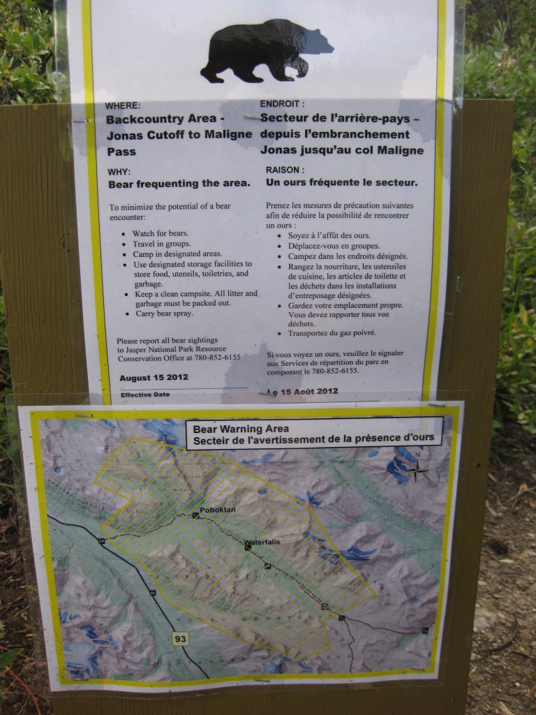Day 122nd August 2012 We drove north to the Athabasca Pass park centre and, after some discussion, managed to pick up permits for our trip. We were informed of a rogue grizzly that was in our intended area. The bear had a wounded hip after being hit by a slow moving freight train- awful! It did put us on alert though as we didn’t want to meet the potentially angry bear.