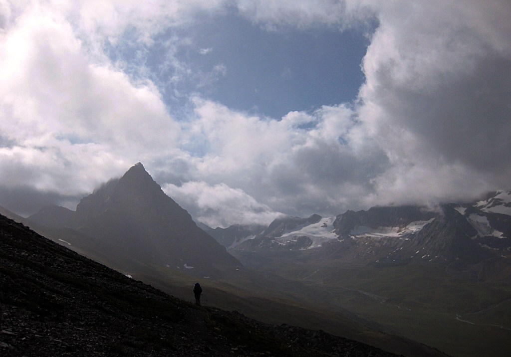 Day 2 23rd August The campsite was set in a gully and stayed quite cold and moist so we were happy to leave and climb out onto open mountain slopes. An easy set of zig zags led to Jonas Shoulder- a high pass with great mountain views under a leaden cloudy sky.