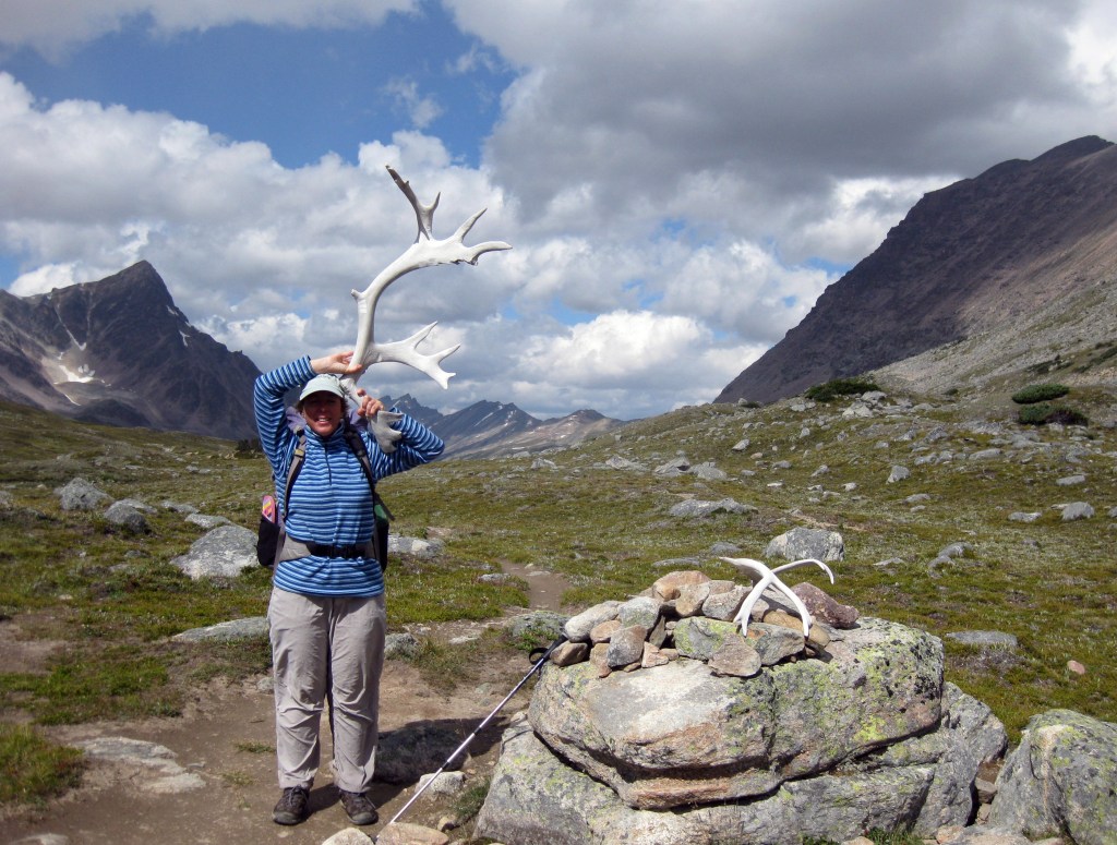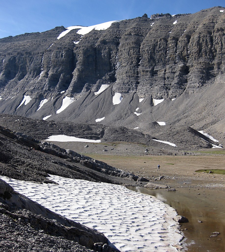 The walk east was pleasant on good trails to Baker Lake in a scenic open landscape. On the way we saw pika, bald eagles and a loon at the lake. After pitching the tent we headed north over Cottongrass Pass then were pleased to see some interesting crinoid fossils. The cluster of buildings at the rather quaint Skoki Lodge provided a break and a coffee in the luxurious wooden interior. Next we headed west on a grand balcony trail to Merlin Lakes under the north wall of yesterday’s peak, Mt Richardson. A great spot but it was too windy to linger.