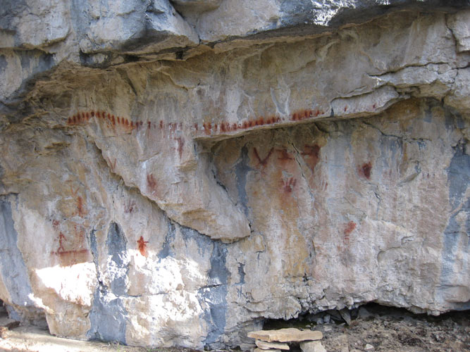 Day 4 25th August More heavy frost on the tent, the zips creaked as we opened the front porch. Passed a pictograph panel on a huge boulder on the way down the valley.