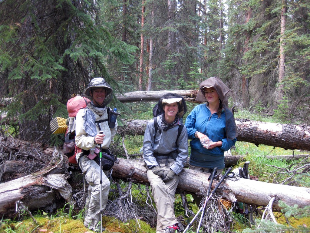Further down we hit a junction with the Cline River trail and we set off on a very sketchy line through thick forest clambering over much deadwood. Lo and behold just when we thought we were lost we saw three other hikers coming towards us – Jellybean , Six and Spiff(?). They were hiking the whole Great Divide Trail northwards and had started at the US border. We had a enjoyable lengthy chat with them comparing notes on long distance hiking. That was fun!