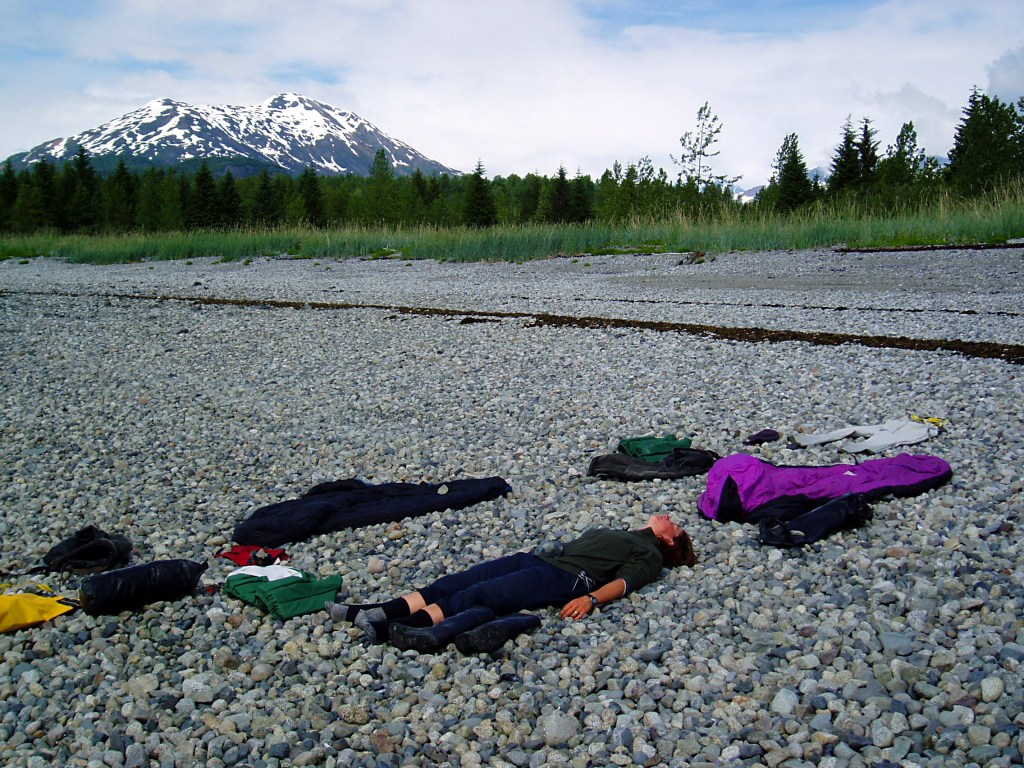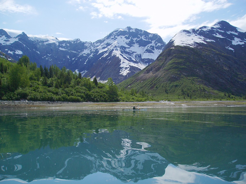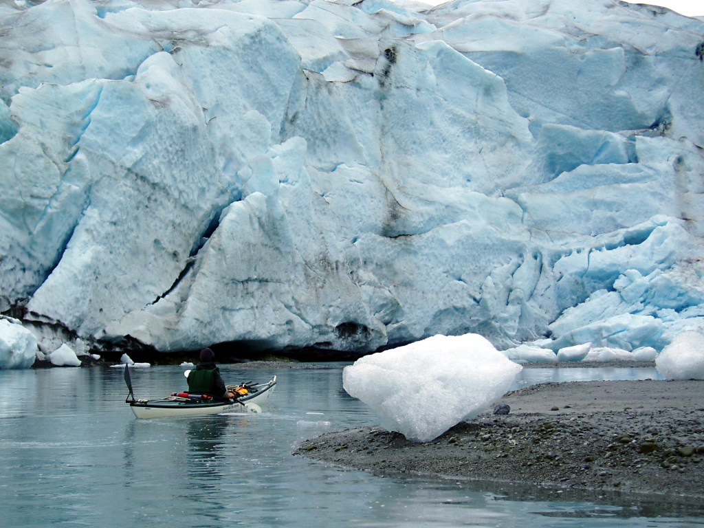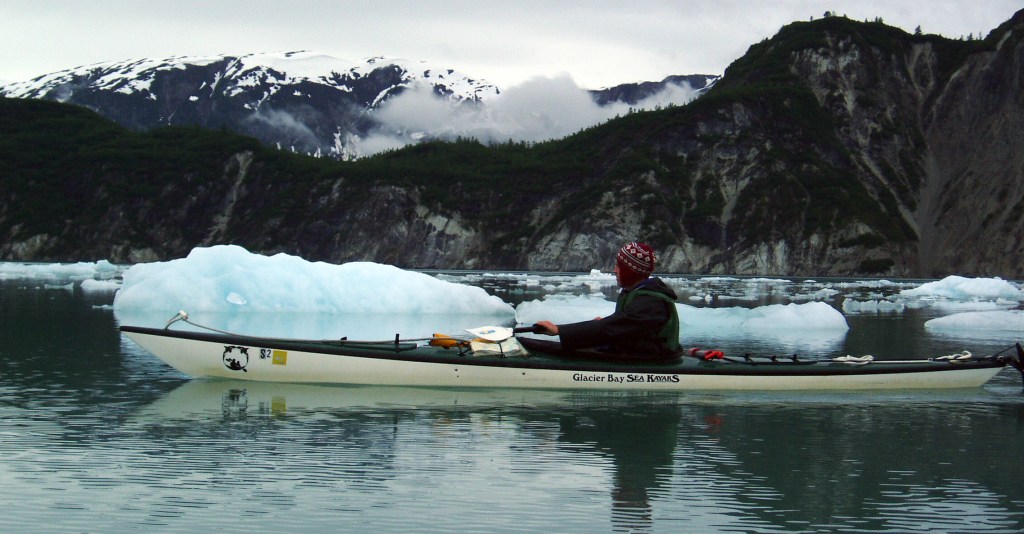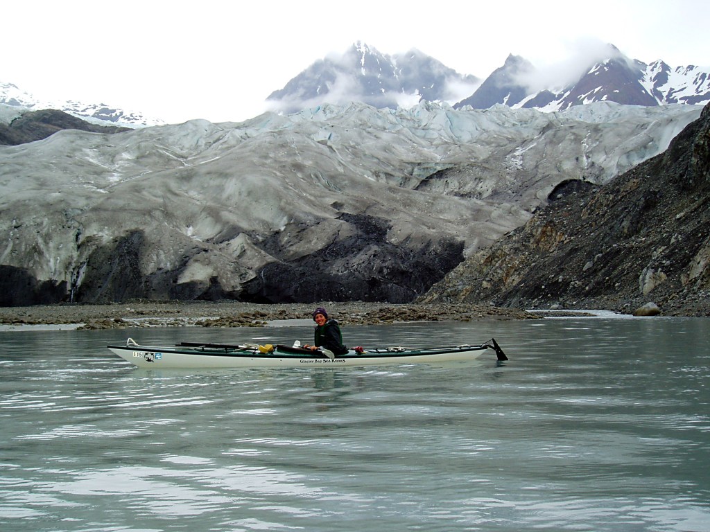 We beach the kayaks on silt delta at the foot of Riggs and McBride glaciers. This was a stunningly dramatic place. The two glaciers don’t quite reach sea level anymore but Riggs in particular was impressive: a clean white, blue, one mile wide ice wall!
