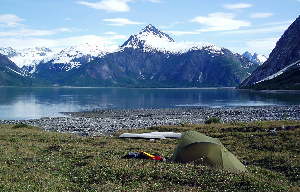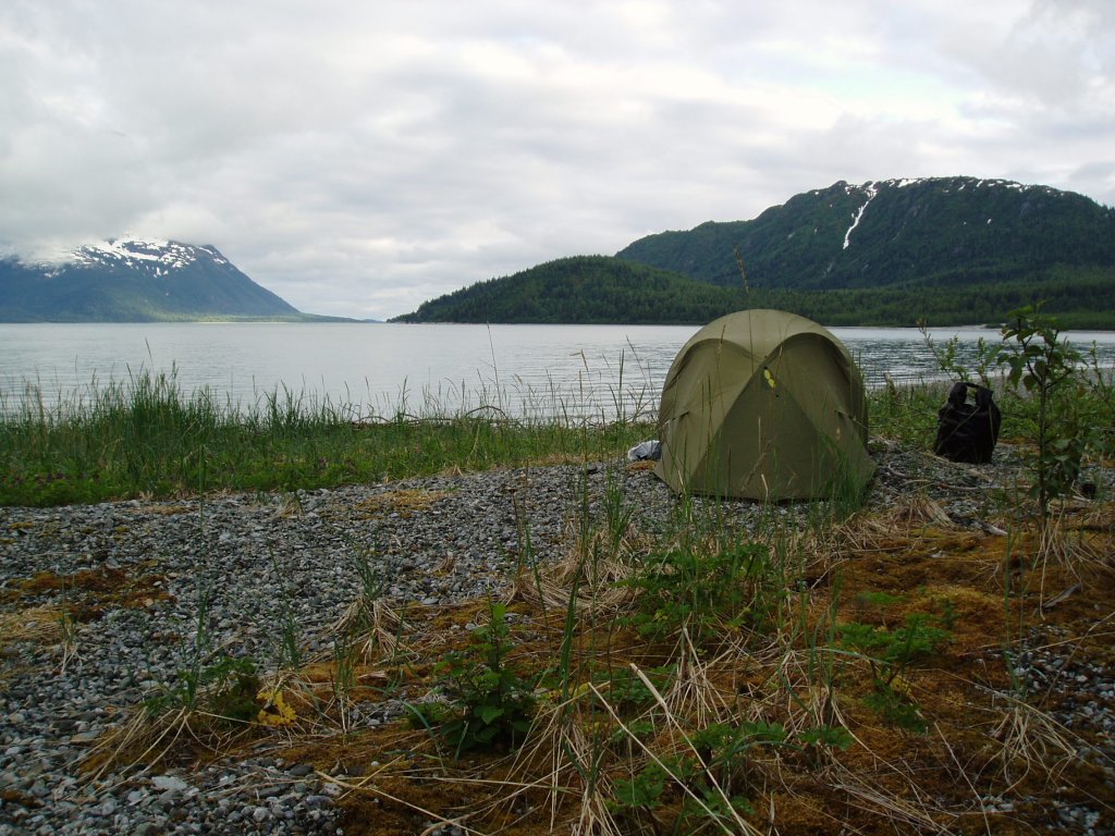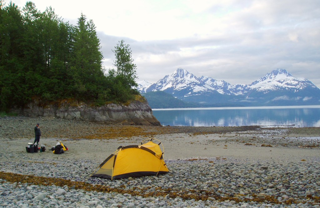 We waited for high tide to come in at this pleasant spot with snowy mountains as a backdrop before paddling back out west followed playfully by a harbour seal for about 20 minutes. The wind and waves picked up again as we reached the mouth of Adams Inlet so we stopped to camp on a pebbly beach. We were now within about 5 miles of the Mount Wright pick up point where the tourist boat was expected to appear about 9.30am each morning. So our plan was to get up super early in the morning and hope that the weather calmed down a bit, so that we could paddle there round an exposed coast before tidying our gear up to be collected by the boat. The day had been gray again but we were a little demob happy and looking forward to a shower.