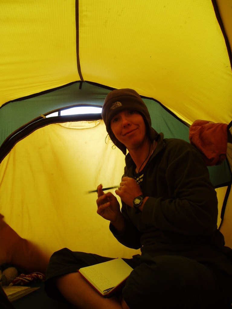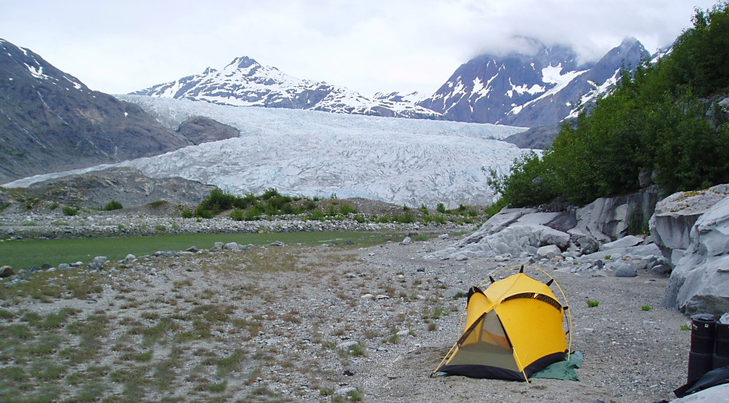 After pitching the tent and sheltering from the rain, we eventually hiked out towards Riggs glacier over gravel terrain but were stopped by a deep outflow channel from McBride. So instead we hiked to McBride over moraines and alluvial rocks for a close up view. Martina sank into the porridge like “quicksand” of one of the cold glacier run-off streams and got wet up to her hip. After that we beat a retreat back to the tent to warm up!