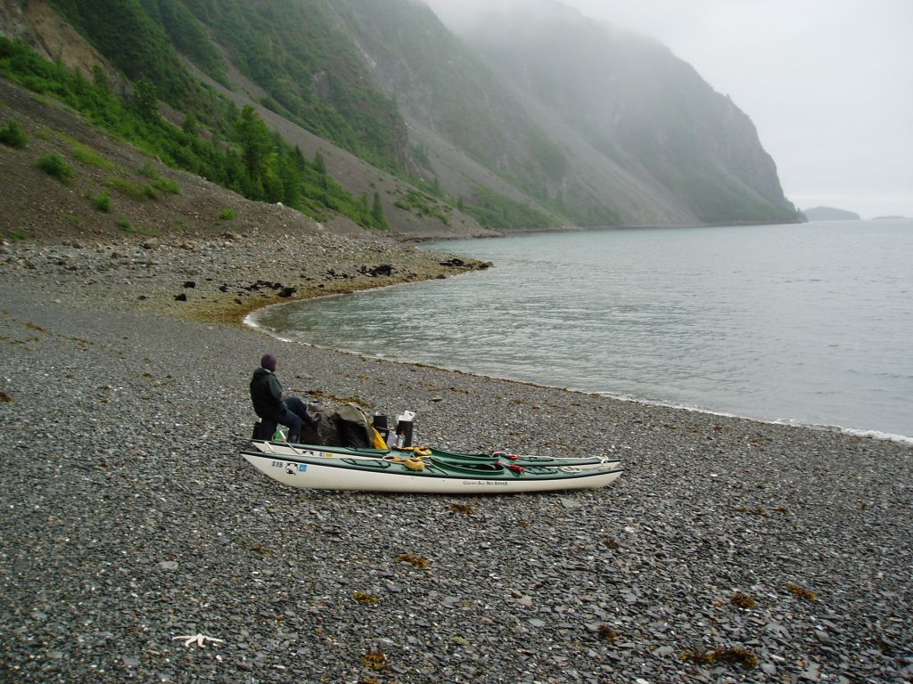 Along the rockier final shore we hit choppier conditions again and the sea wasn’t giving us up easily but we finally rounded the headland to run the kayaks up the beach below Mount Wright- made it! Its was a bit of a grim and forbidding place in the dull windy weather but at least it was solid ground. We were hours early for the boat and passed the time with sorting our gear and exploring the beach pebbles and seaweed.