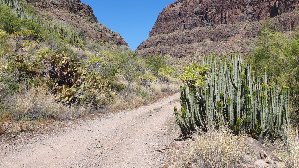 The Cicerone guide’s follows a road for its first day to the small town of Ayagaures. Being keen to avoid the road I saw a line to the east on the map which followed jeep tracks up Barranco de Los Vicentes. This worked well for me providing a quiet wander up through an arid valley with cactus and palm trees lining the hillsides. I climbed up at the head of the barranco on a good trail to a viewful dirt road that zig zagged down to Ayagaures to rejoin the guide book route.