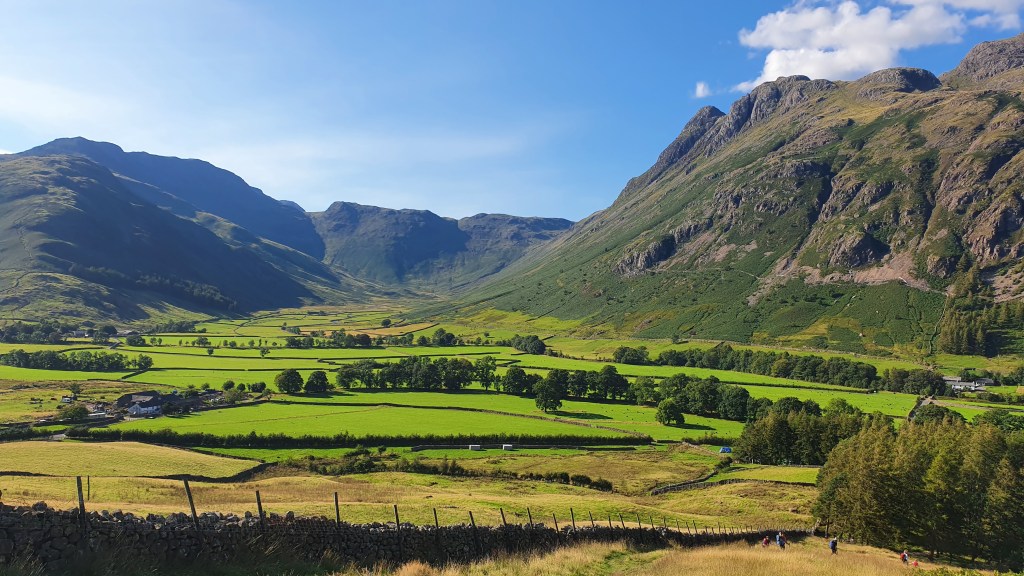 From there I headed out into more open hill country up Langstrath (the well named long valley). I sped past a couple of waterfalls that were thronging with people, but I did have a quick cooling dip in the river a bit higher up. The going got hot as I went over Stake Pass with it’s glacial drumlins and down to Langdale with more excellent climbing crags above.