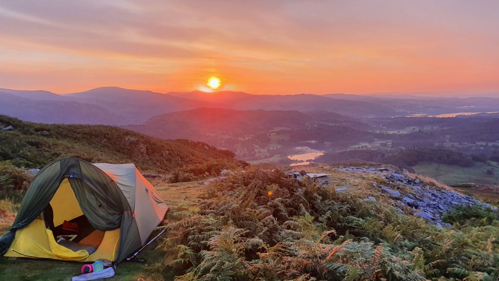 The hills again beckoned for tonight’s camp and I traversed Lingmoor Fell to the south of Langdale. Here I experienced a first for camping on hill tops- I needed to put in my ear plugs to dampen the sound of music floating up from a party in the valley below!